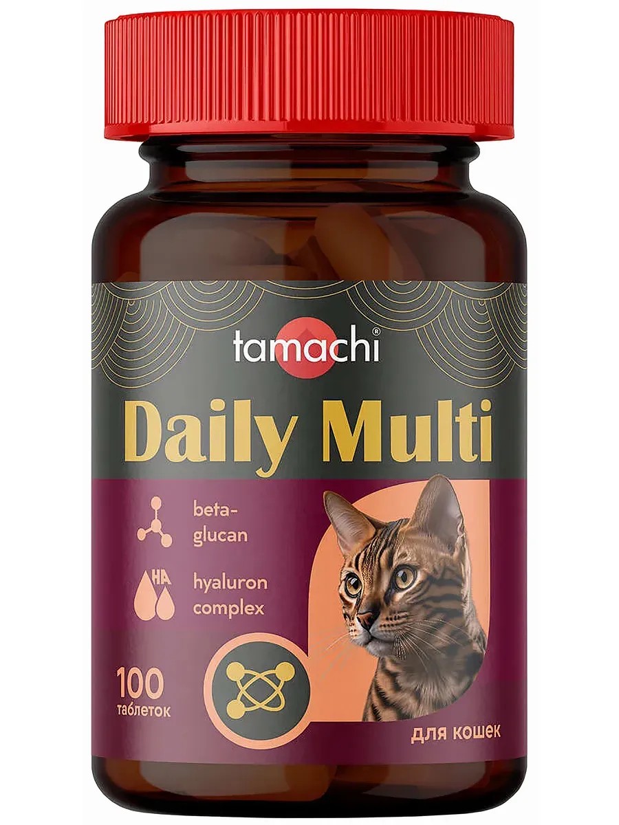 Tamachi Daly Multivitamin and mineral complex for cats, to normalize metabolism and support immunity, 100 tablets. Tamachi Daly Multivitamin and mineral complex for cats, to normalize metabolism and support immunity, 100 tablets. A unique formula with beta-glucan and hyaluronic acid complex helps strengthen the immune system, reduces the risk of disease, and replenishes the balance of vitamins, macro- and microelements. Ingredients: Dry demineralized whey, mineral premix, vitamin premix, beta-glucan, sodium hyaluronate, taurine, calcium citrate, freeze-dried beef liver or dried meat products, aerosil A, fucoidan, squalene, calcium stearate. Directions: Use this feed supplement daily, either incorporating it into the feed or administering it orally by hand before feeding, at a rate of 1 tablet weighing 0.5 g per 5 kg of body weight. The course of treatment is 3 months. Repeat use is possible if necessary. Storage: Store the product in the original packaging, protected from direct sunlight, separate from food and feed, at a temperature of 0°C to 25°C and a relative humidity of no more than 75%. Keep out of the reach of children.