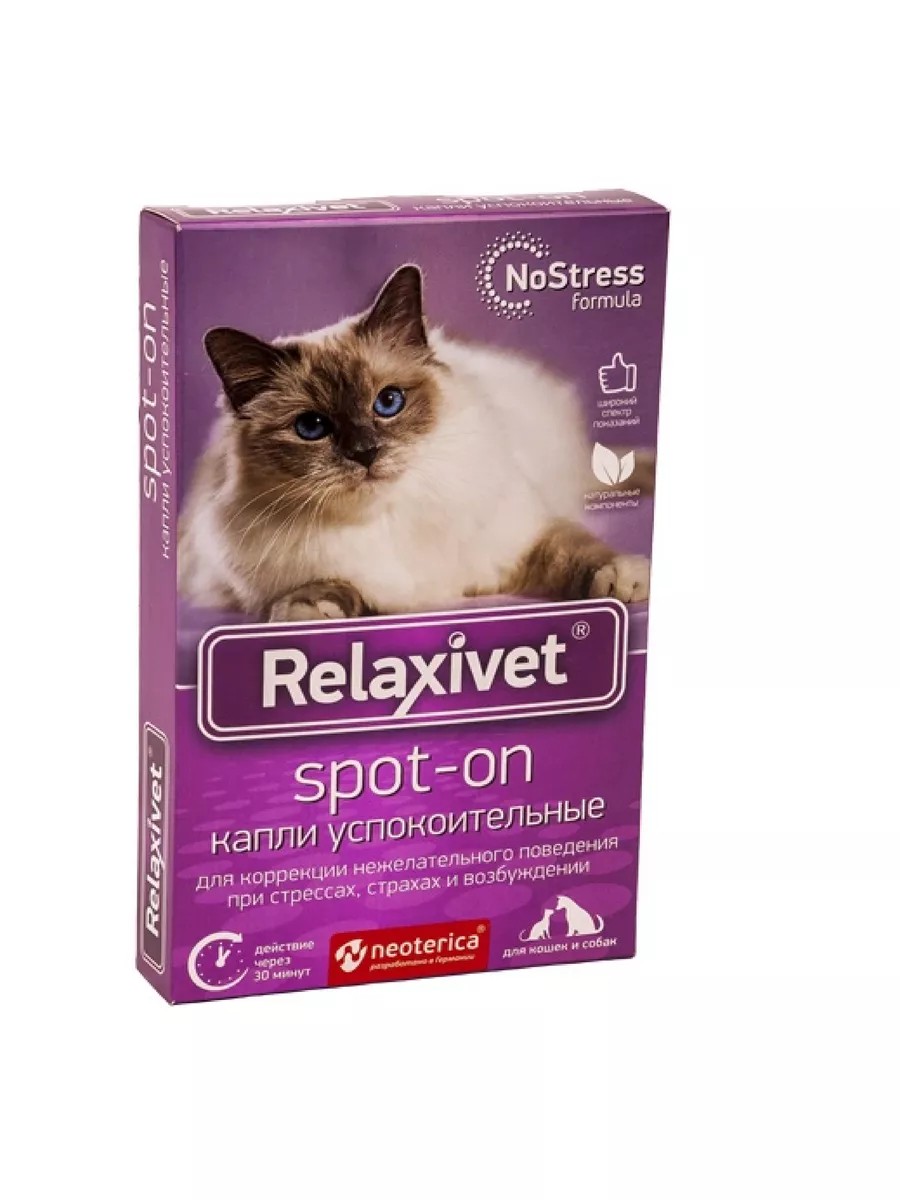 NEOTERICA, Капли для кошек и собак Relaxivet Spot-On успокоительные на холку 4 пипетки, 1 упаковка. Релаксивет спот-он успокоительный предназначен для коррекции нежелательного поведения при стрессах, страхах и возбуждении у кошек и собак.