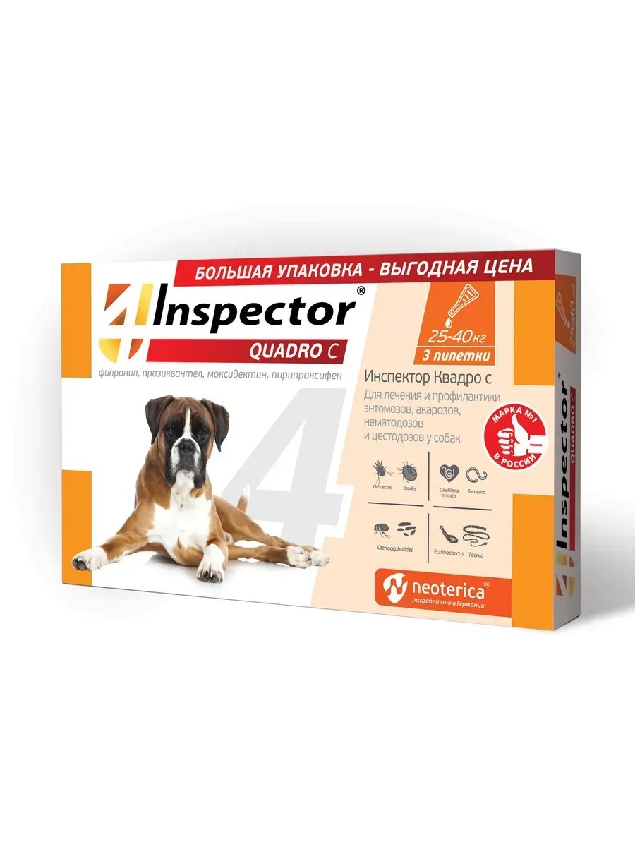 Inspector защищает от 20 видов внешних и внутренних паразитов. Inspector — это инсектоакарицид и антигельминтик.