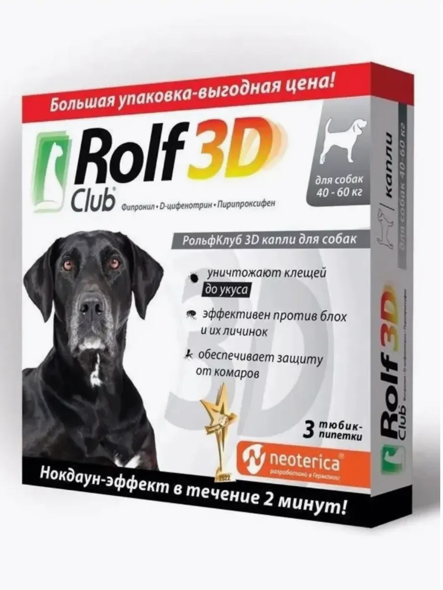 Rolf Club 3D Tick and Flea Drops for Dogs Weighing 40-60 kg, 3 Pipettes. Rolf Club 3D Drops for Dogs are an insectoacaricidal product. Fipronil, D-cyphenothrin, and pyriproxyfen, which are included in the product, exert a contact insectoacaricidal effect on adult and immature (larval) stages of fleas, lice, chewing lice, sarcoptic, otodectic, and ixodid ticks that infest dogs. They also protect animals from blood-sucking flying insects (mosquitoes, midges, and sand flies). Rolf Club 3D Drops for Dogs has a pronounced knockdown effect, with the onset of knockdown time being approximately 2 minutes, preventing ticks from attaching during an attack. It also has a repellent effect on blood-sucking flying insects. Fipronil's mechanism of action involves disrupting the passage of chloride ions through GABA-dependent receptors in ectoparasites, impairing nerve impulse transmission and nervous system function, leading to paralysis and death of the arthropods. D-cyphenothrin's mechanism of action involves blocking the transmission of nerve impulses in insects, causing impaired motor coordination, paralysis, and death of the ectoparasites. D-cyphenothrin has a rapid knockdown effect on insects and ticks, which occurs upon first contact with the fur of the treated animal. Pyriproxyfen's mechanism of action involves disrupting chitin synthesis and larval molting, preventing the development of fully developed pupae, and causing the death of insects in the pre-imaginal stages of development, which leads to a halt in the replenishment of the ectoparasite population. After application to the skin, the active ingredients are evenly distributed over the body's surface without being absorbed into the systemic bloodstream. They accumulate in the epidermis, hair follicles, and sebaceous glands of the animal, providing long-lasting insecticidal and acaricidal protection against insects and ticks.