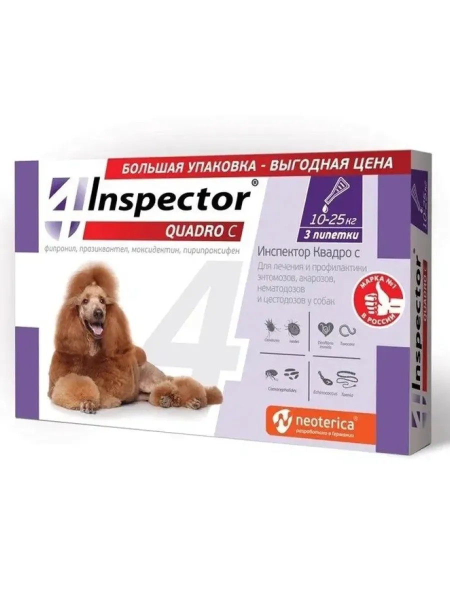 | Полное наименование товара | Инспектор для собак 10-25 кг, капли на холку от блох и клещей ( 3 пипетки) |