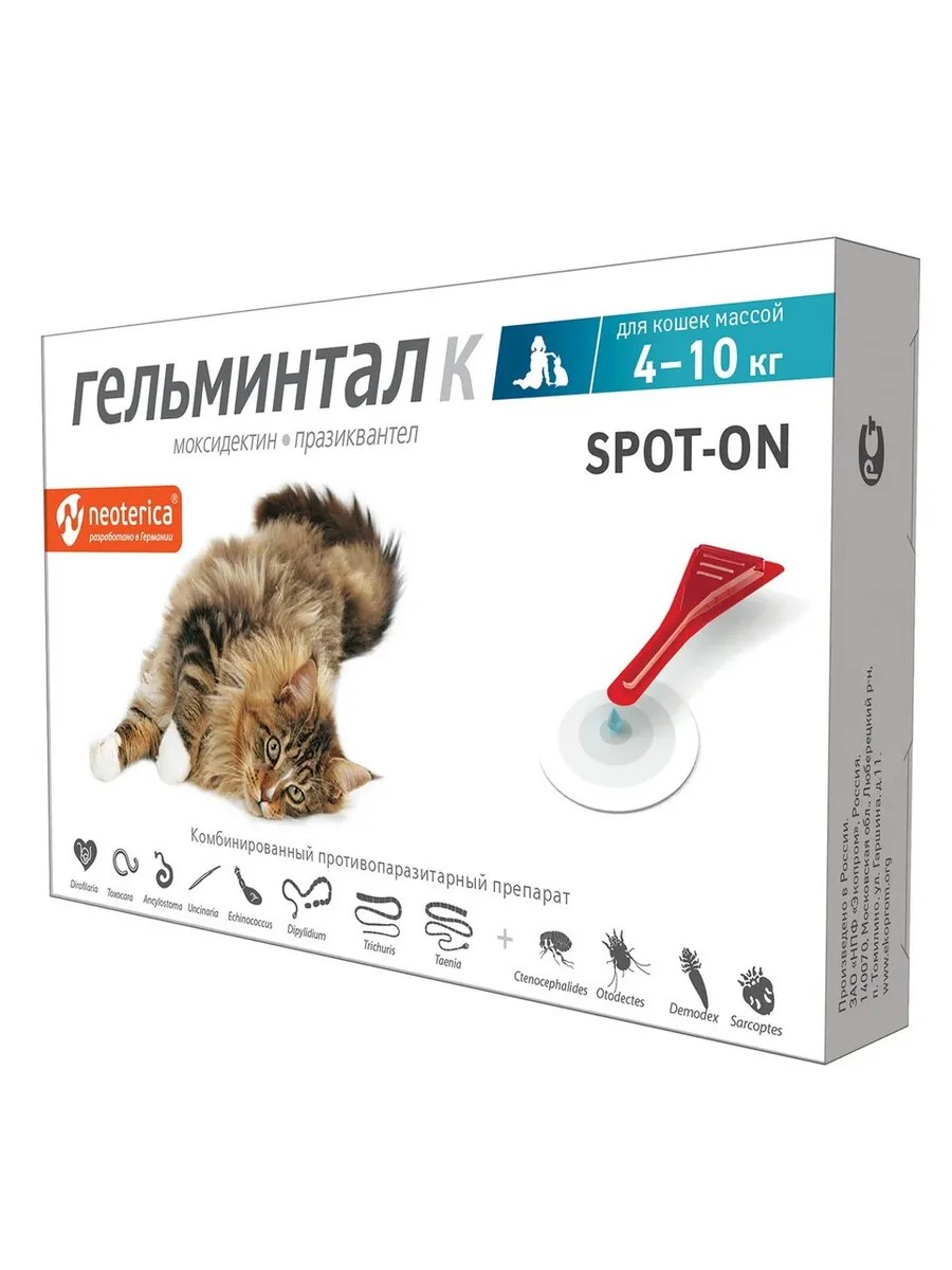 Гельминтал Spot-on для кошек - препарат широкого спектра действия. Давайте препарат однократно, как с профилактической, так и с лечебной целью. Капли действуют 1 месяц.