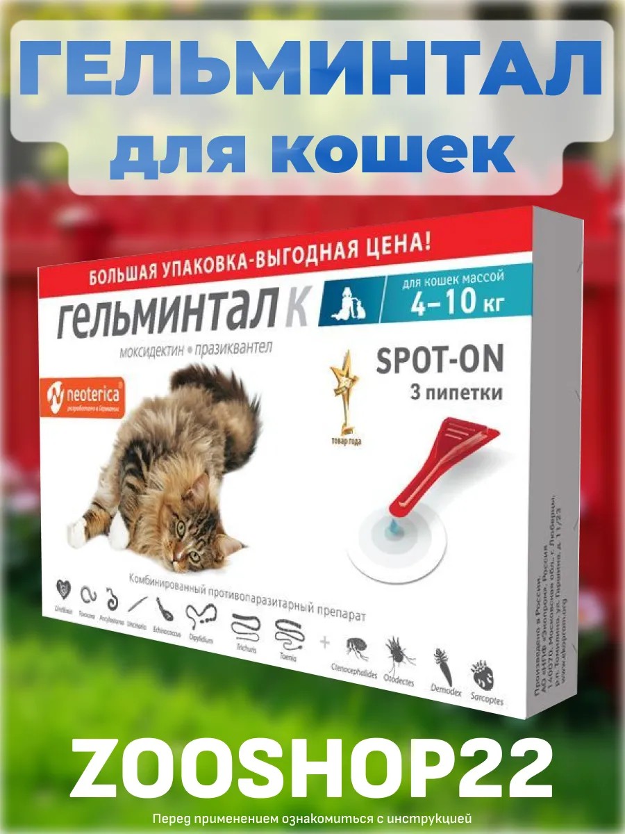 | Полное наименование товара | Гельминтал спот-он капли на холку от глистов для кошек и котов 4-10 кг: против круглых и ленточных гельминтов, для дегельминтизации, при гельминтозе |