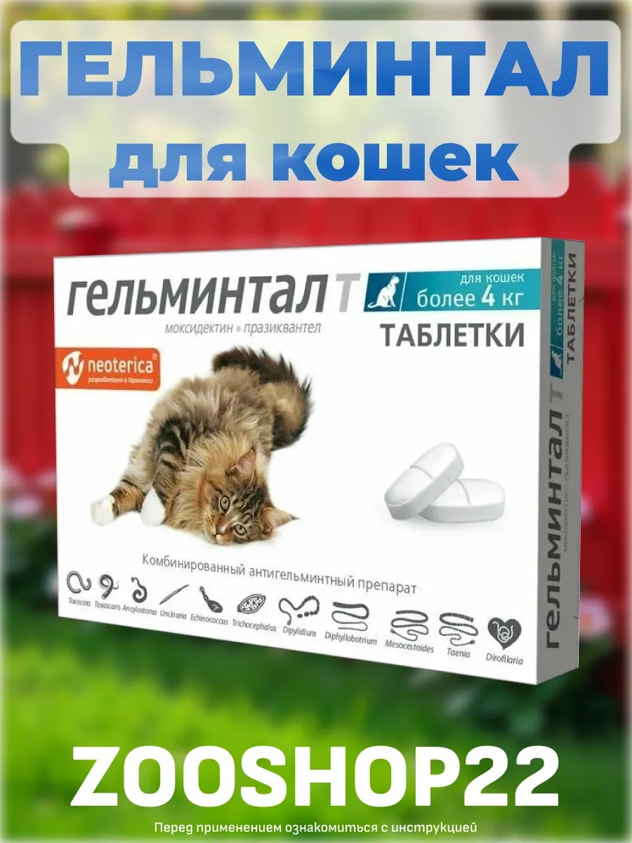 | Полное наименование товара | Гельминтал таблетки от глистов для кошек и котов от 4 кг: против круглых и ленточных гельминтов, для дегельминтизации, при гельминтозе, 2 таблетки |
