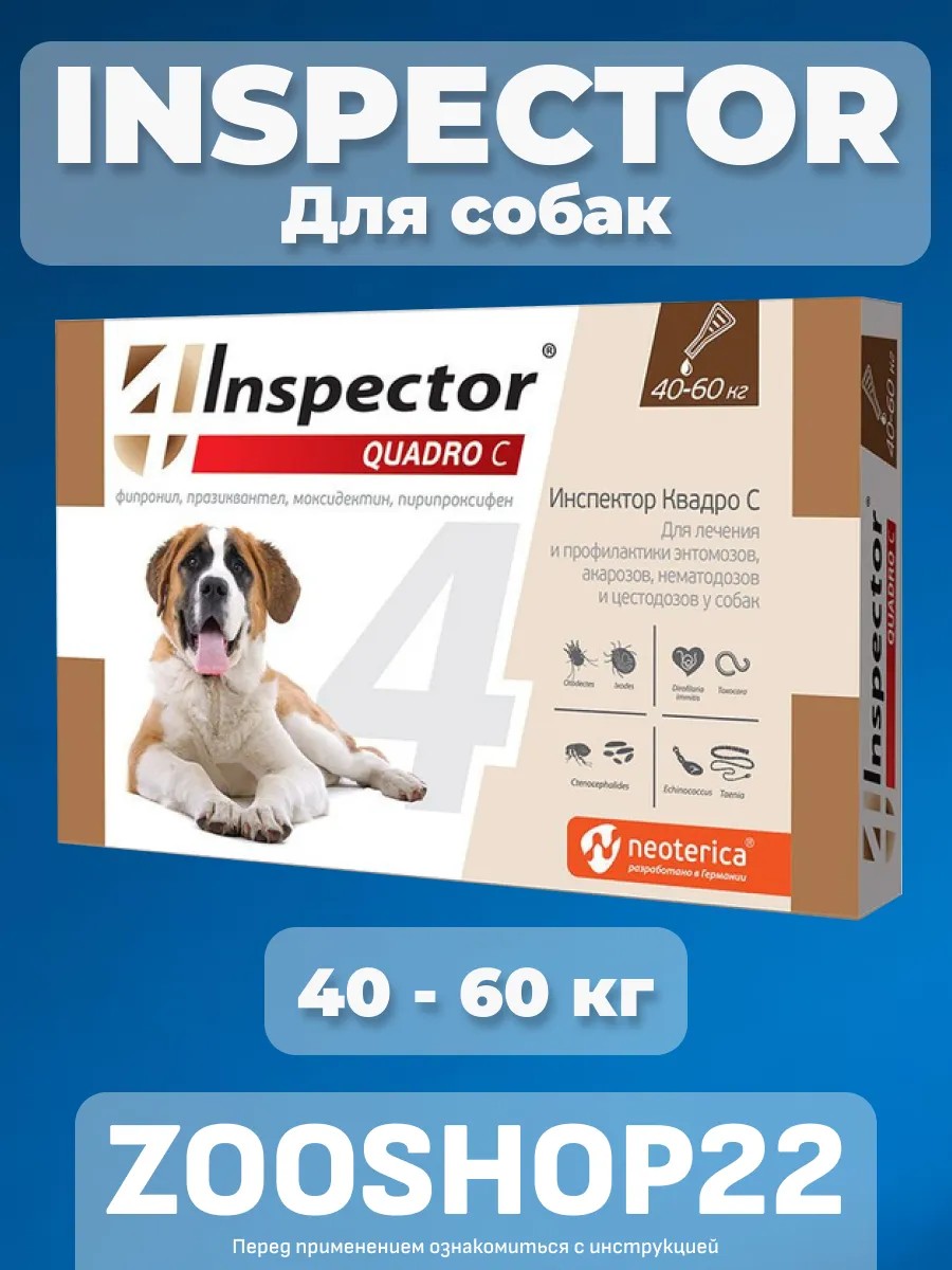 «Инспектор Квадро С для собак 40–60 кг», «капли от клещей и глистов для крупных пород», «комплексная защита от дирофиляриоза», «фипронил и празиквантел для больших собак».
