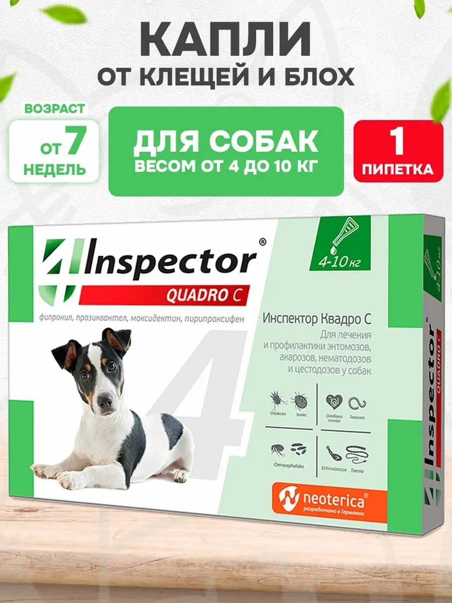 Inspector Quadro S is prescribed to dogs for the treatment and prevention of entomoses, otodectosis, notoedrosis, acarosis caused by ixodid ticks, nematodosis of the gastrointestinal tract (toxocariasis, toxascariasis, uncinariasis, ancylostomiasis), cestodiasis (teniasis, dipylidiasis, mesocestoidosis, diphyllobothriasis), and also for the prevention of dirofilariasis.