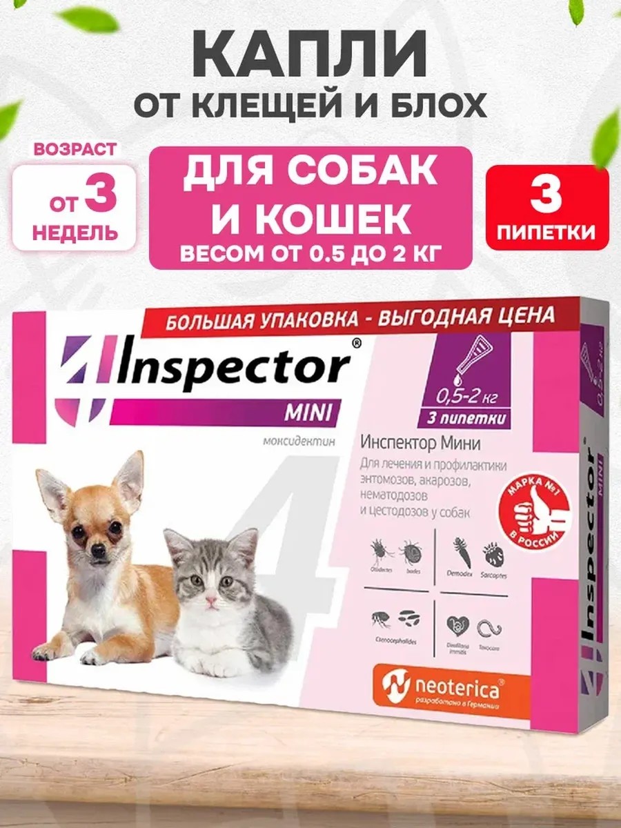 Капли против внутренних и внешних паразитов Inspector Mini для собак от 0,5 до 2 кг и кошек.