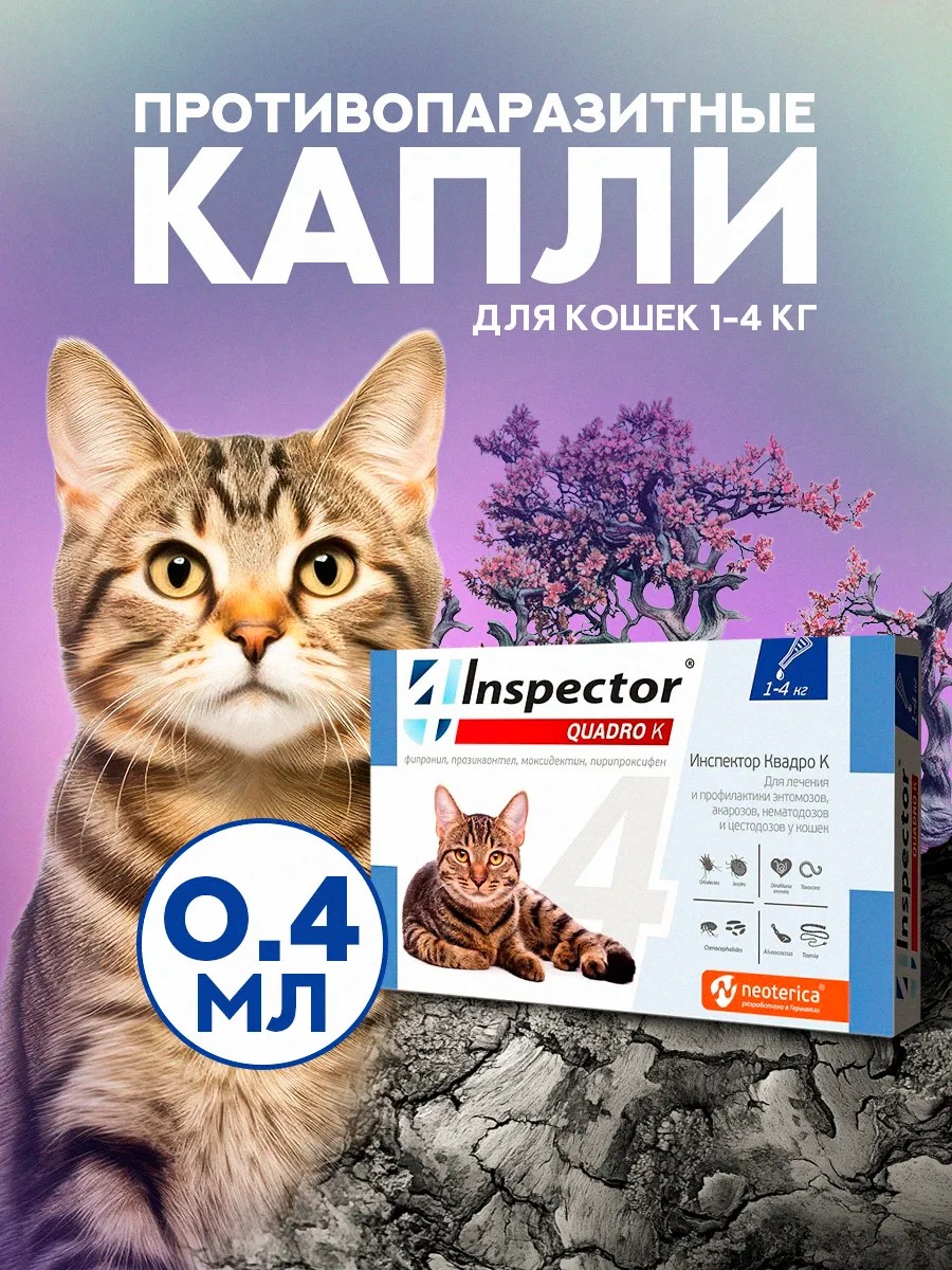 Инспектор Квадро К — мощное оружие против 20 видов наружных и внутренних паразитов! Этот комплексный препарат защищает кошек от опасных заболеваний, переносимых клещами, гельминтами и другими паразитами.