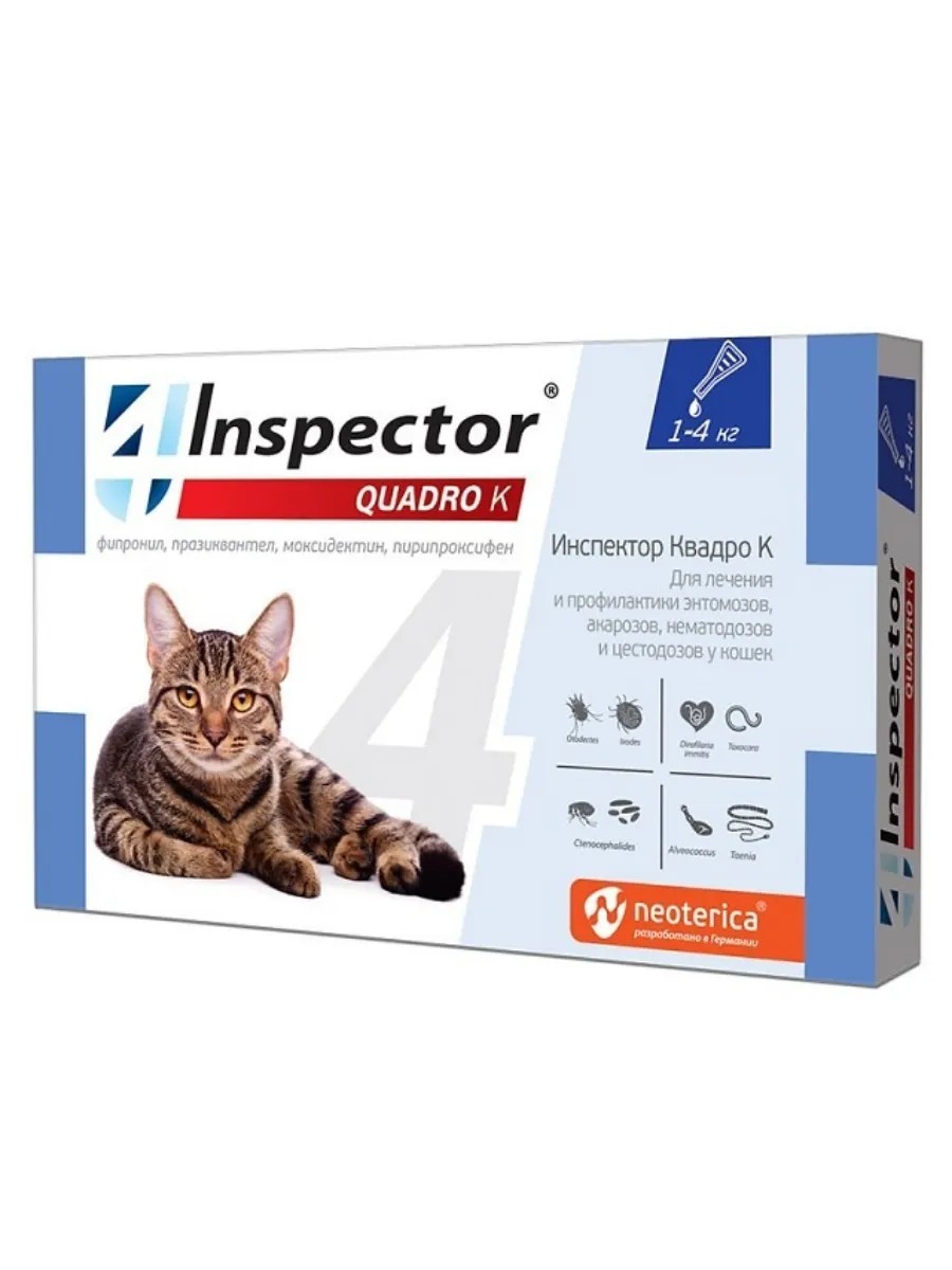 Инспектор Квадро К — комплексный препарат от 20 наружных и внутренних паразитов.