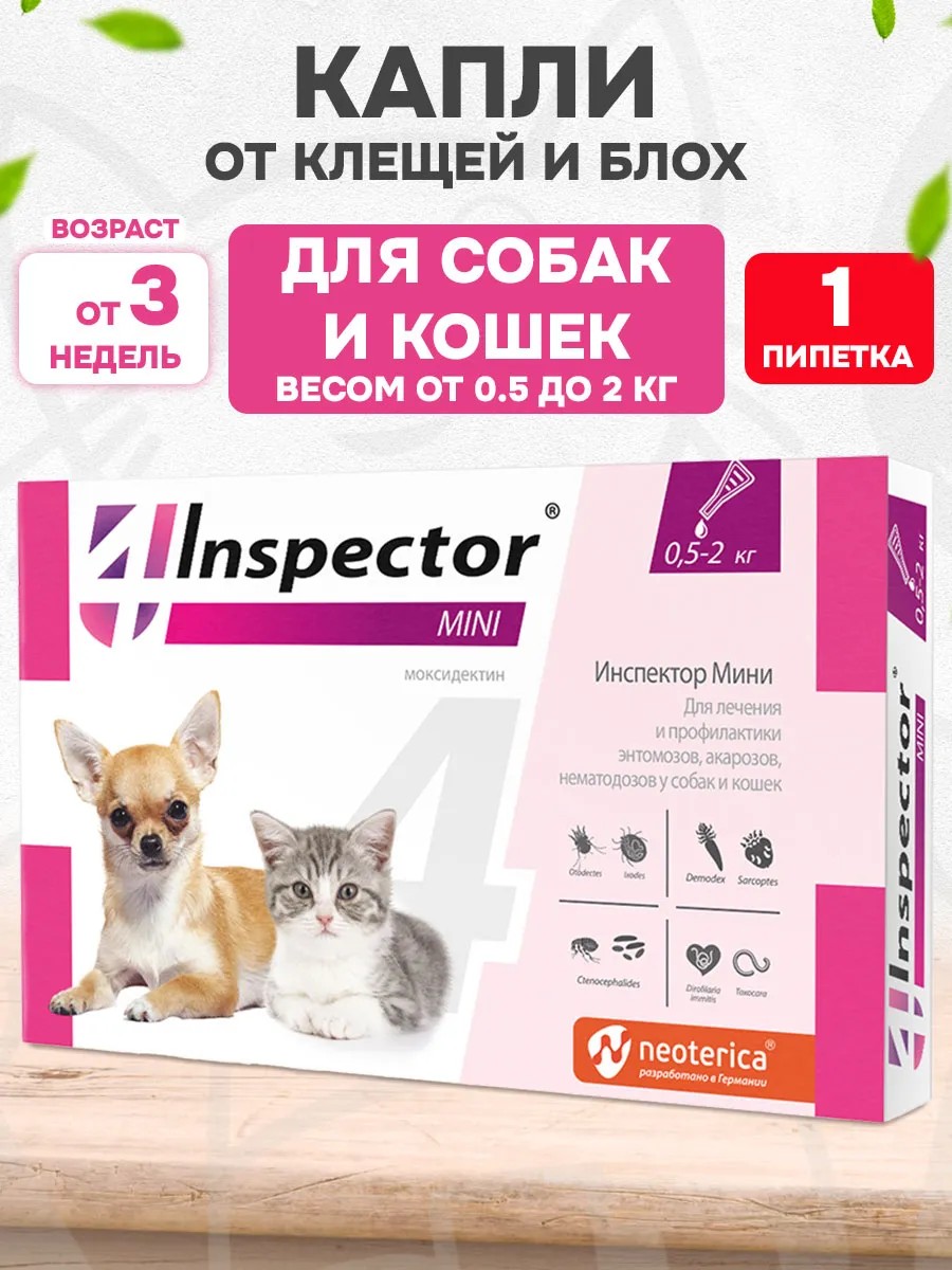Инспектор Мини назначают котятам, щенкам, а также собакам и кошкам весом от 0,5 до 2 кг для лечения и профилактики энтомозов (блохи, вши, власоеды), акарозов (иксодидозы, отодектоз, нотоэдроз, саркоптоз, демодекоз) и нематодозов желудочно-кишечного тракта (токсокароз, токсаскаридоз, унцинариоз, анкилостомоз, трихоцефалез), а также в целях профилактики дирофиляриоза.