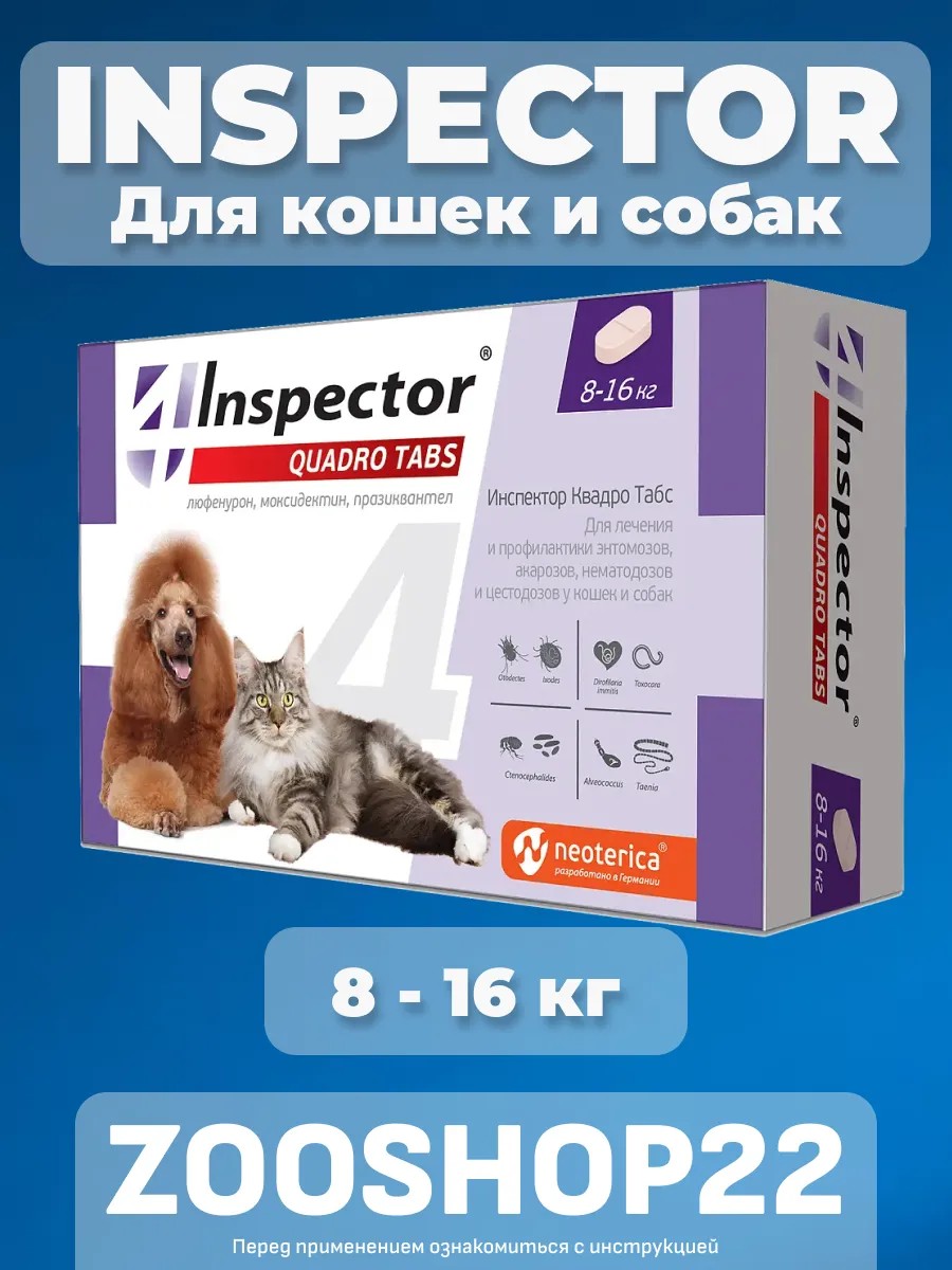 | Полное наименование товара | Инспектор Квадро (Inspector Quadro) таблетки от глистов для кошек, собак, котят и щенков 8-16 кг: против круглых и ленточных гельминтов, для дегельминтизации, при гельминтозе |