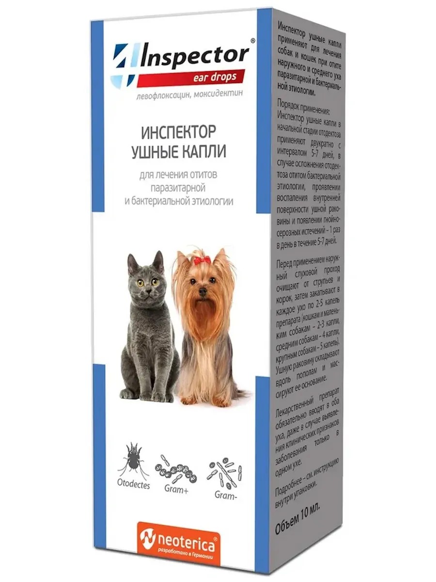 Капли ИНСПЕКТОР предназначены для ухода за ушами кошек и собак. Эти эффективные ушные капли имеют объем 10 мл и обеспечивают надежную защиту ваших питомцев от различных ушных заболеваний. Препарат помогает при зуде, воспалениях и инфекциях, облегчая состояние вашего любимца.