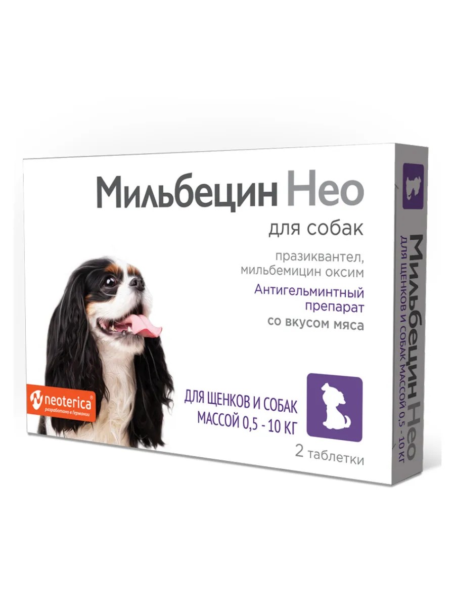 Полное наименование товараМильбецин Нео со вкусом мяса для щенков и собак массой 0,5 - 10 кг