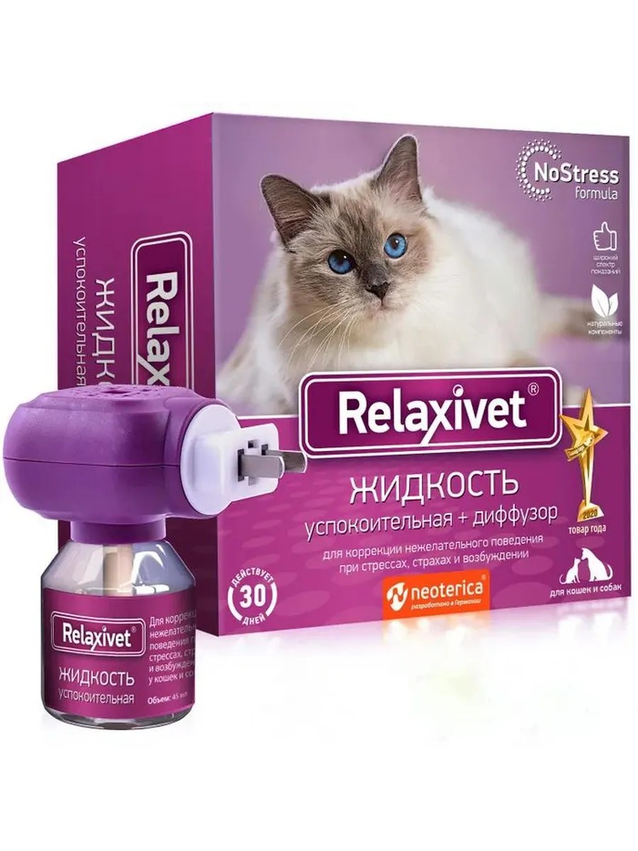 Комплект из успокоительной жидкости и электрического диффузора Релаксивет обеспечивает целый месяц спокойствия для всех: