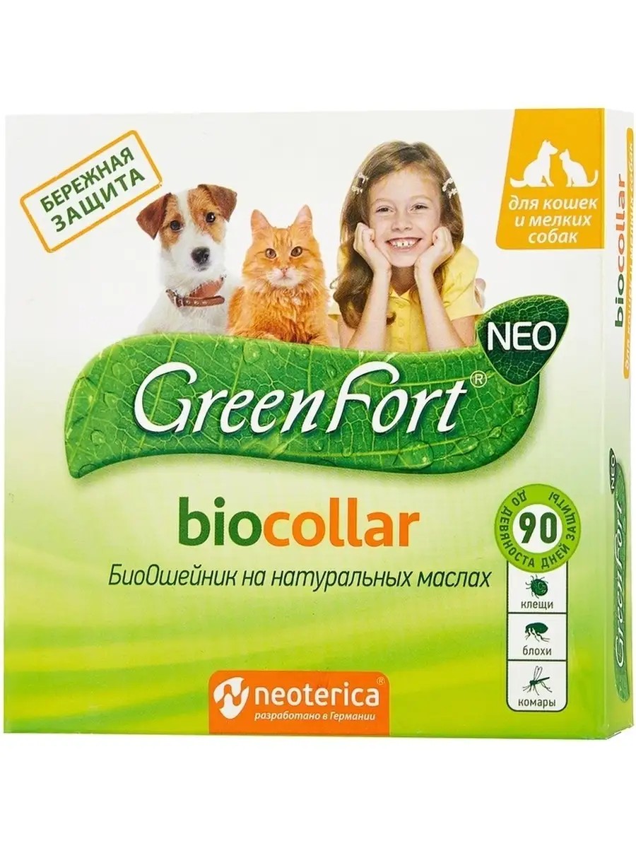 Ошейник репеллентный для кошек и мелких собак с натуральными маслами Био Green Fort neoterica. это эффективное средство защиты животных от эктопаразитов, созданное на основе натуральных масел. Эфирные масла, входящие в состав, отпугивают эктопаразитов, а также снимают раздражение и зуд. Ошейник предназначен для собак мелких пород и кошек. Безопасен для беременных и кормящих самок, детенышей, больных, выздоравливающих и склонных к аллергии животных. Защищает от иксодовых клещей, блох, вшей, власоедов, комаров, мух и слепней на срок до 90 дней.Состав разработан фирмой Veterinary Bio (Германия).