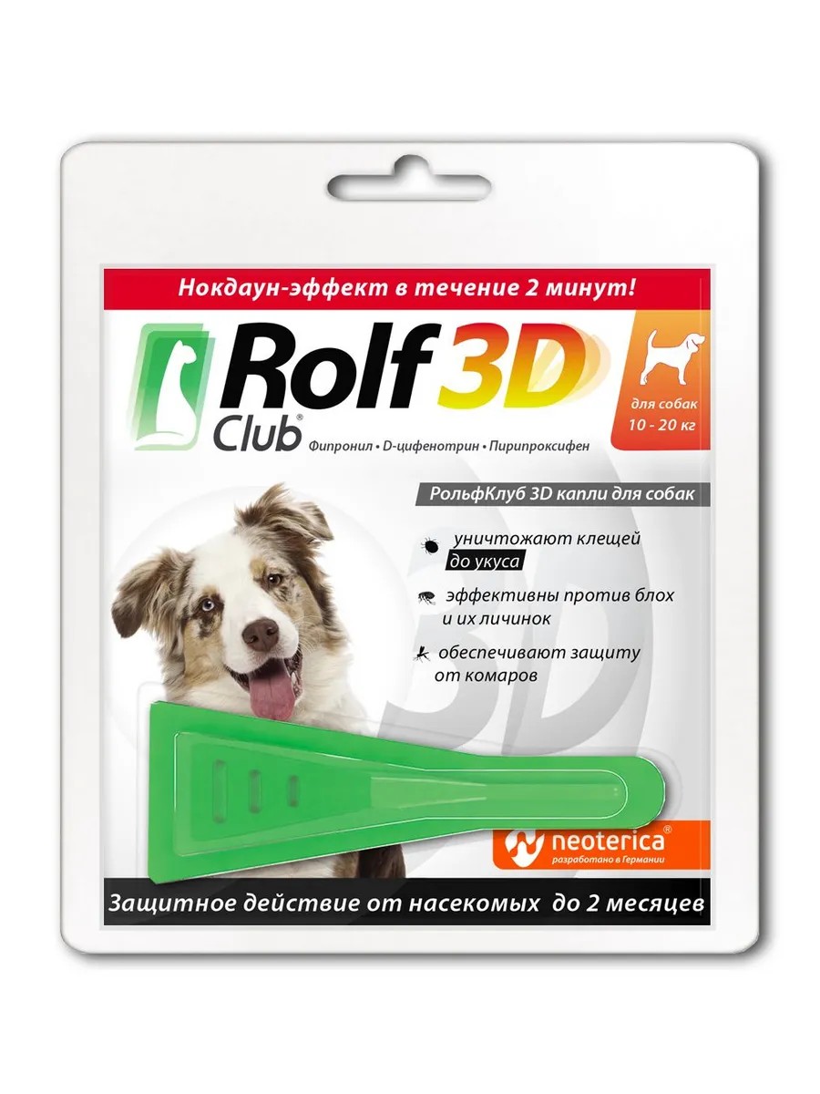 Rolf Club 3D Drops for Dogs for Ticks, Fleas, and Mosquitoes. Protection against 10 types of external parasites: ixodid mites, ear mites, sarcoptic mange mites, demodectic mites, fleas (at all stages of development), lice, chewing lice, as well as mosquitoes, black flies, and midges. Thanks to its new, improved formula, the product kills parasites before they bite, providing long-lasting protection against infection and inhibiting parasite reproduction. The drops accumulate in the sebaceous glands, ensuring prolonged action, rather than entering the bloodstream. The safety of RolfClub drops was confirmed during developmental studies, with no adverse effects observed even when the recommended dose was exceeded several times. Treated animals can be washed and bathed without losing their effectiveness. Parasites do not develop a tolerance to the three-component formula. Tick protection for up to 1 month Flea protection for up to 2 months Mosquito protection for up to 7 days Rolf Club 3D Formula The revolutionary formula was developed in collaboration with Veterinary Bio (Germany) and provides 3 powerful levels of protection. 1. D-cyphenothrin (provides a knockdown effect: paralyzes and destroys ticks and insects before they bite); 2. Fipronil (kills existing insects and ticks, provides long-lasting protection); 3. Pyriproxyfen (interrupts the parasite’s development cycle and prevents the emergence of the next generation). D-cyphenothrin begins to act upon the first contact of ticks and insects with the fur and skin of the treated animal and blocks the transmission of nerve impulses in parasites. This leads to an immediate knockdown effect (impaired coordination and paralysis of the ectoparasite) and the destruction of ectoparasites before they bite. This eliminates the risk of animal infection with piroplasmosis and other life-threatening infectious diseases. When handling the product, observe general personal hygiene and safety precautions as required for handling medicinal products. Store the product out of the reach of children.