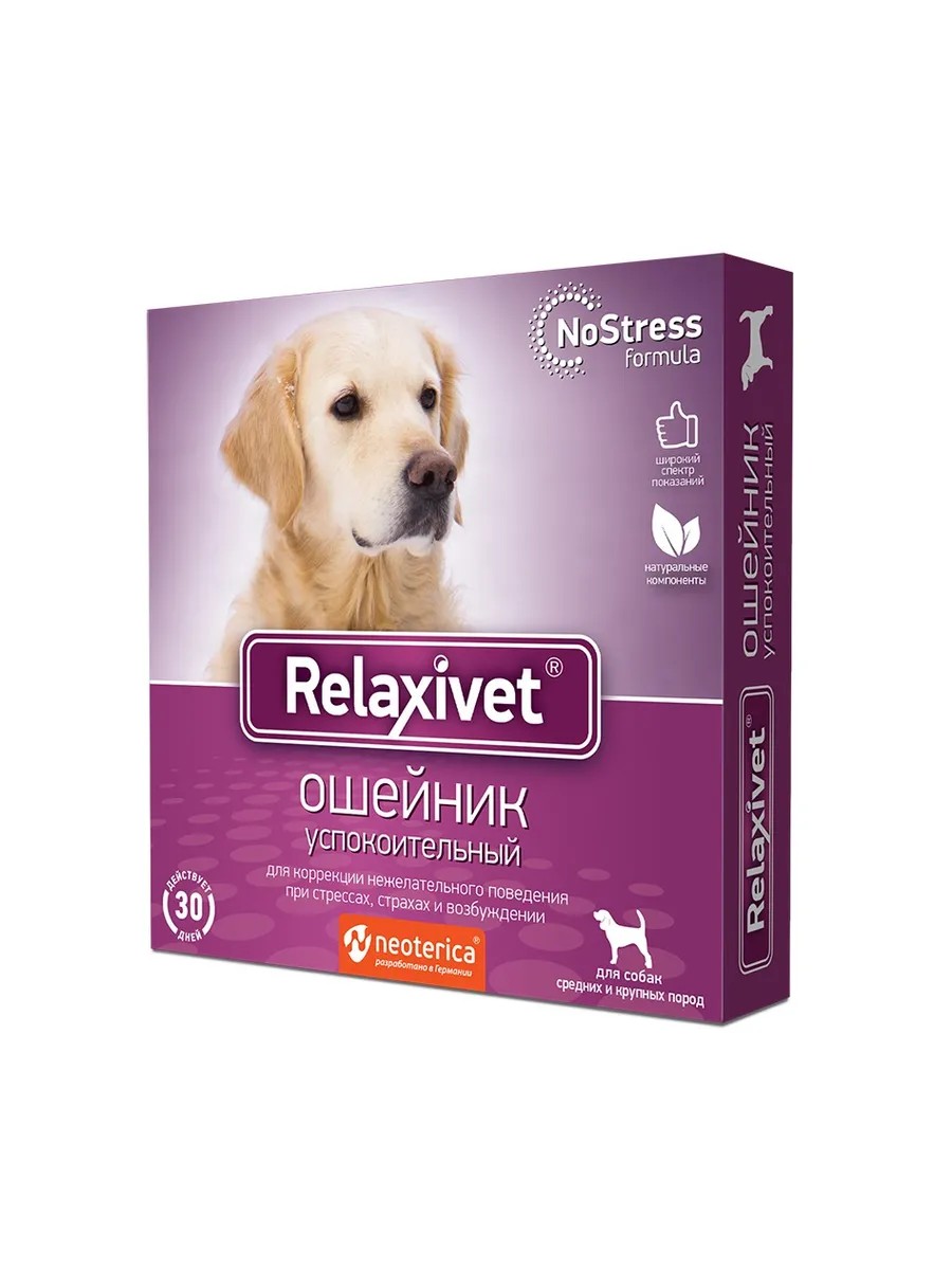 Успокоительный ошейник Relaxivet благотворно влияет на нервную систему, способствует снятию нервного напряжения и беспокойства у животных, особенно при адаптации к новым условиям и половом возбуждении.