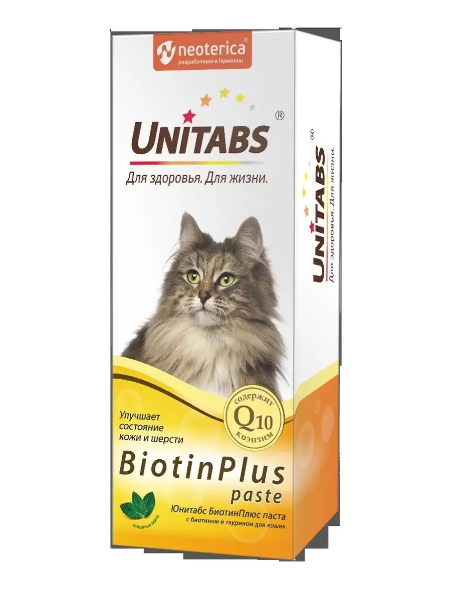 Паста витаминная для кошек котов котят Юнитабс Биотин Плюс 120 мл neoterica неотерика. Unitabs BiotinPlus это витаминно минеральный комплекс для кошек, который содержит коэнзим Q10 и все необходимые витамины, макро и микроэлементы для улучшения состояния кожи и шерсти. Unitabs BiotinPlus: сокращает линьку, стимулирует рост шерсти, обеспечивает здоровье кожи, укрепляет иммунитет. Давайте витаминную пасту кошкам в период линьки, для улучшения состояния кожи и шерсти, для устранения сухости и шелушения кожи. В состав входят биотин, цинк и медь являются строительным материалом шести, стимулируют ее рост и профилактируют выпадение, витамины группы В и А питают кожу, сокращают линьку и стимулируют рост шерсти, придавая ей эластичность и блеск, таурин незаменимая аминокислота для кошек, необходима для поддержания здоровья и качества шерсти. Порядок применения перорально, ежедневно из расчета 1 г пасты на 1 кг массы животного, что соответствует 2 или 2,5 см полоски пасты из тюбика