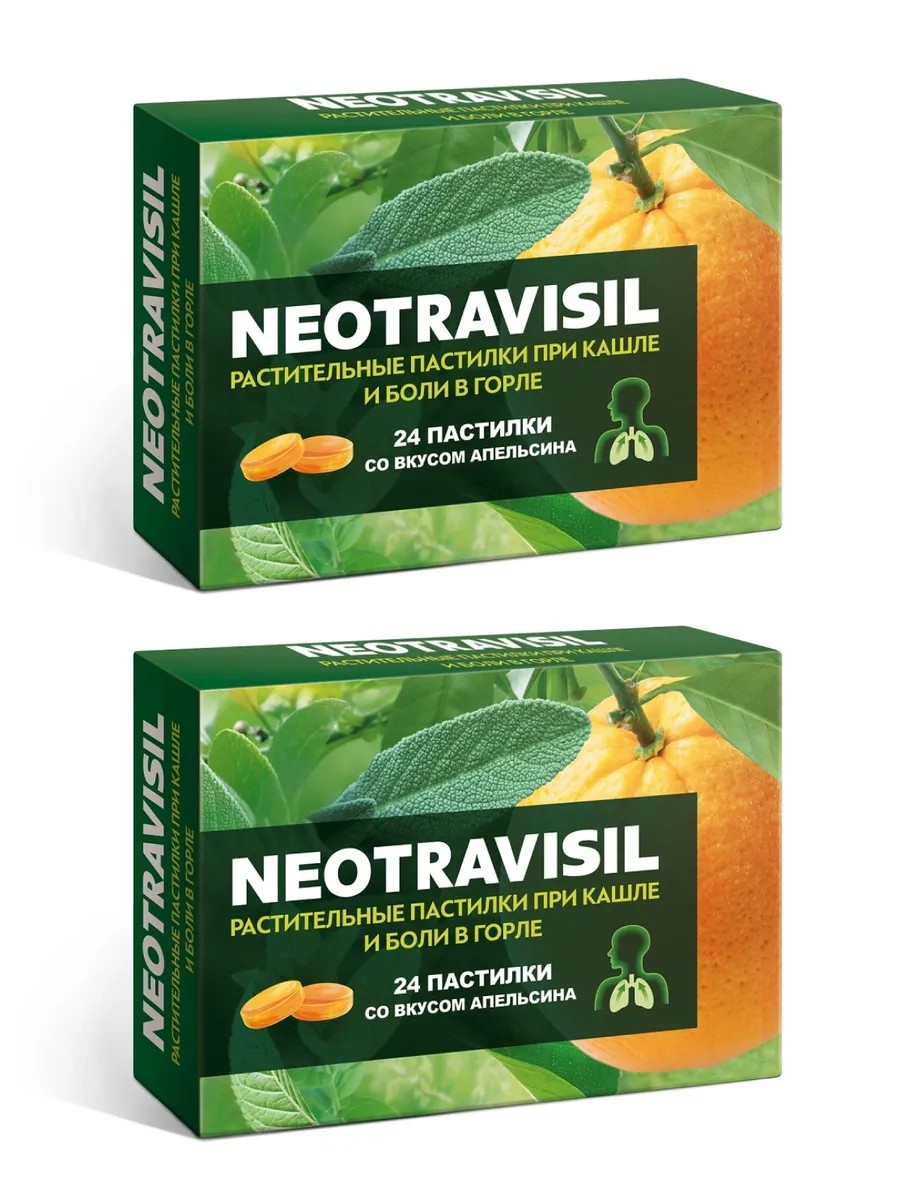 Neotravisil orange-flavored herbal lozenges are a dietary supplement containing an innovative combination of four medicinal herbal extracts: licorice, eucalyptus, camphor, mint, and orange fruit extract. The combined effect of these ingredients provides dual action, helping with coughs and sore throats. Spearmint extract has antispasmodic, antiseptic, and analgesic properties, and is used to treat sore throats and colds. Naked licorice extract has anti-inflammatory, expectorant, and antispasmodic properties; it is used to treat upper respiratory tract conditions (pharyngitis, tracheitis, bronchitis) accompanied by coughs, hoarseness, and sore throats. Eucalyptus globulus extract has antimicrobial, expectorant, analgesic, anti-inflammatory, and antiseptic properties. Used for various infectious diseases, as well as for their prevention. Adults dissolve 1 lozenge 4-6 times daily. Duration of treatment is 1-2 weeks. Treatment can be repeated if necessary.