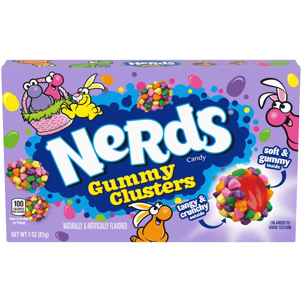 Nerds Gummy Clusters are a novel combination of flavors and textures—tart, crunchy, sweet, and gummy—and vibrant, bite-sized portability. Rainbow Nerds surround fruity and gummy centers. These pretty little sparks are fantastic inventors. A vibrant cluster, filled with tangy and crunchy nerds. A candy so tasty, there are no words. Taste the crunchy, gummy, and delicious invention. INSTRUCTIONS FOR USE Consume responsibly. This product is intended to be eaten and does not require specific instructions for use. It is generally safe for children aged 3 and over. The serving size is 85g (3-pack), which suggests the entire pack is intended for one serving.