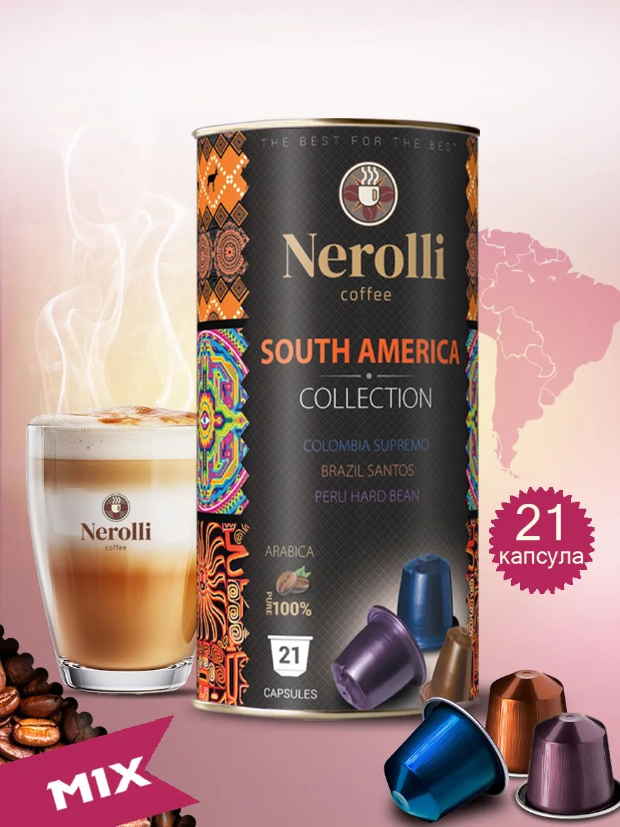 Кофе в капсулах Nerolli Южная Америка- это оригинальный бленд из натуральной обжаренной молотой 100% арабики, собранного на лучших плантациях Южной Америки и произведенных по итальянским технологиям.