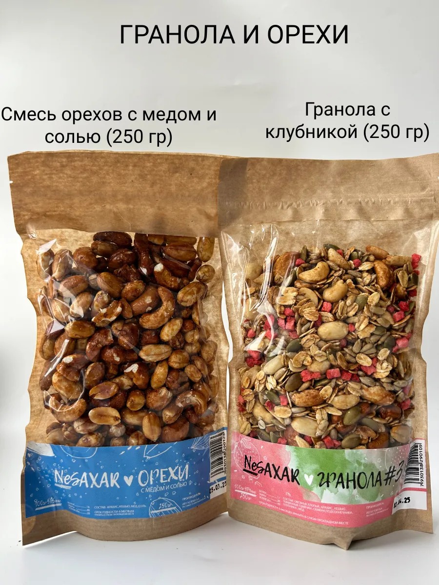 В наборе гранола с клубникой и кешью (250 гр ) и смесь орехов (арахис, кешью) с медом и солью (250 гр)