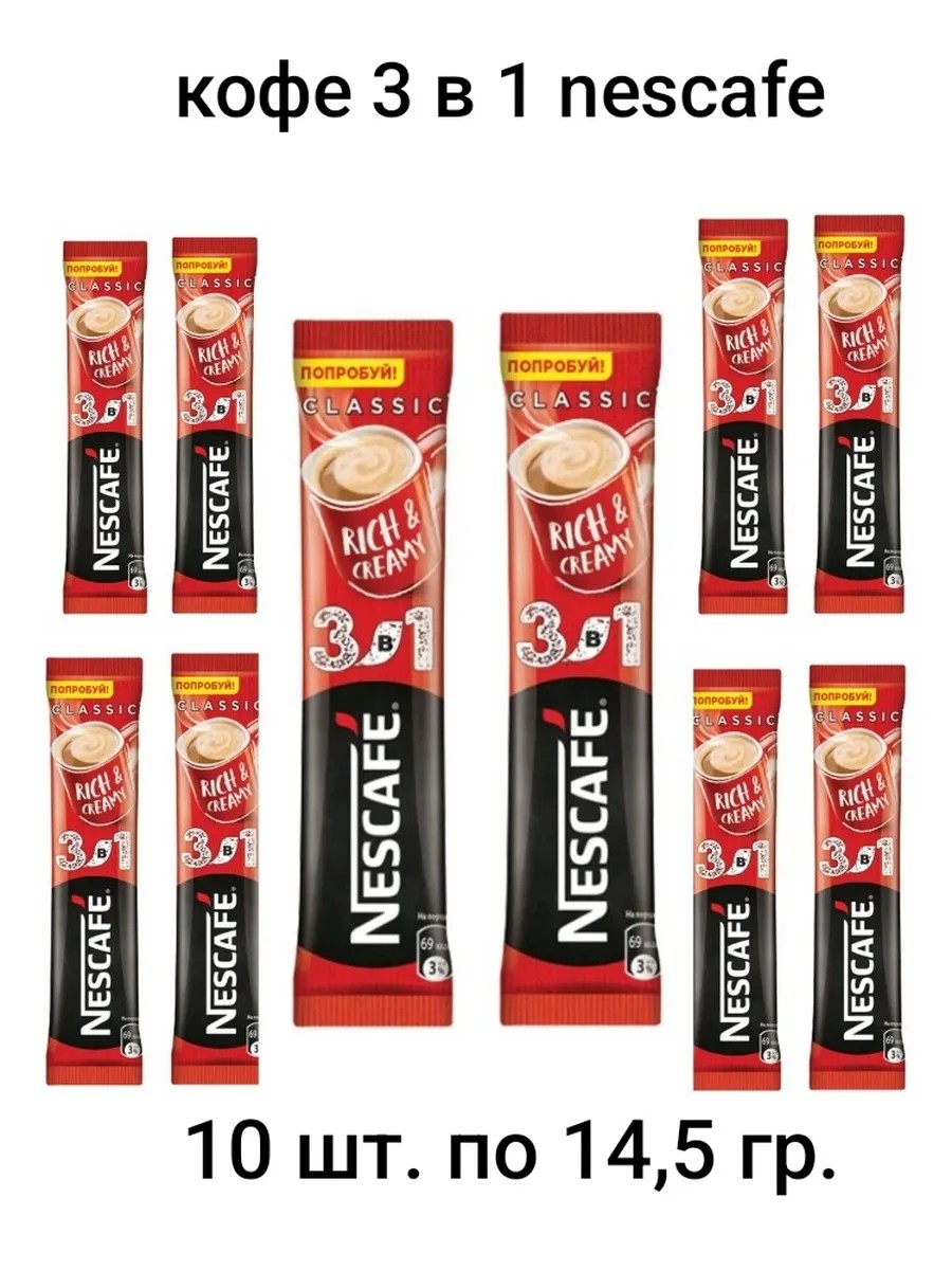 Кофе 3 в 1 в пакетиках растворимый Nescafe — это вкусный кофейный напиток в удобной упаковке 10 шт кофе в стиках по 14,5 грамм! Это сочетание даёт яркий и неповторимый вкус и насыщенный аромат Кофе Три в Одном. Идеальная чашка кофе, которая дарит наслаждение всегда и везде. Это растворимый кофейный напиток, который не только наполняет энергией, но и дарит богатство ощущений благодаря насыщенному вкусу, а также удобству употребления в любое время при любых обстоятельствах. Каждый пакетик содержит классическую комбинацию из трех заботливо смешанных компонентов: великолепный бразильский кофе, голландские сливки и малайзийский сахар. Теперь кофе растворимый в пакетиках можно заварить где угодно: на работе, пока все стоят в очереди к автомату, в путешествии у костра, на перерыве между занятиями. Вам понадобится только доступ к горячей воде и кружка, а насыщенный кофейный вкус с нежной пенкой сделает вашу паузу еще приятнее. Фольгированная упаковка предотвращает попадание в смесь влаги и неприятных запахов, поэтому вы можете смело класть пакетики кофе 3в1 в карман сумки, независимо от ее размера и дальности поездки. Отрывной верх позволяет приготовить любимый растворимый кофе в пакетиках еще быстрее, всего за несколько секунд. Попробуйте заварить ароматный капучино в пакетиках. Кофе порционный Nescafe — это выбор спортсменов и путешественников, активных и мобильных людей, которые не теряют время зря.