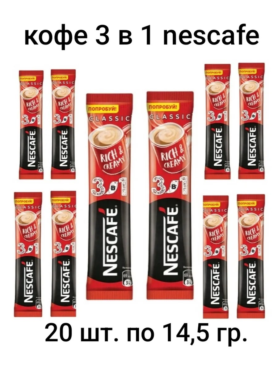 Кофе 3 в 1 в пакетиках растворимый Nescafe — это вкусный кофейный напиток в удобной упаковке 20 шт кофе в стиках по 14,5 грамм! Это сочетание даёт яркий и неповторимый вкус и насыщенный аромат Кофе Три в Одном. Идеальная чашка кофе, которая дарит наслаждение всегда и везде. Это растворимый кофейный напиток, который не только наполняет энергией, но и дарит богатство ощущений благодаря насыщенному вкусу, а также удобству употребления в любое время при любых обстоятельствах. Каждый пакетик содержит классическую комбинацию из трех заботливо смешанных компонентов: великолепный бразильский кофе, голландские сливки и малайзийский сахар. Теперь кофе растворимый в пакетиках можно заварить где угодно: на работе, пока все стоят в очереди к автомату, в путешествии у костра, на перерыве между занятиями. Вам понадобится только доступ к горячей воде и кружка, а насыщенный кофейный вкус с нежной пенкой сделает вашу паузу еще приятнее. Фольгированная упаковка предотвращает попадание в смесь влаги и неприятных запахов, поэтому вы можете смело класть пакетики кофе 3в1 в карман сумки, независимо от ее размера и дальности поездки. Отрывной верх позволяет приготовить любимый растворимый кофе в пакетиках еще быстрее, всего за несколько секунд. Попробуйте заварить ароматный капучино в пакетиках. Кофе порционный Nescafe — это выбор спортсменов и путешественников, активных и мобильных людей, которые не теряют время зря.
