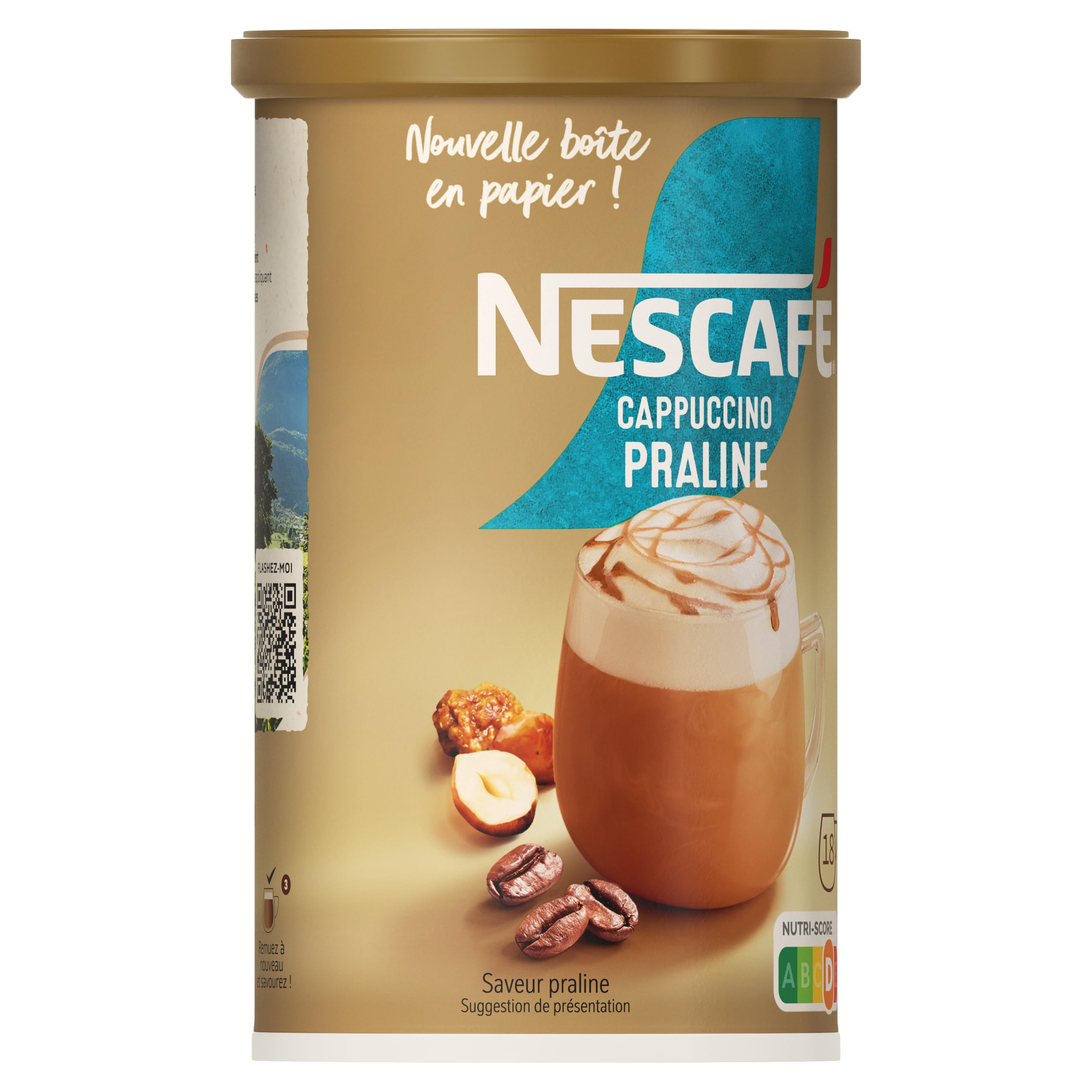Thanks to NESCAFÉ's expertise, enjoy a moment of pure indulgence with a delicious Praline Cappuccino. Our experts have created a gourmet recipe with carefully selected ingredients: quality coffees combining the finesse of Arabica and the richness of Robusta, a rich Praline flavor, and an irresistibly smooth and generous foam. INGREDIENTS INGREDIENTS: sugar, skimmed milk powder 21 , glucose syrup, vegetable oil (coconut), coffee 5 (instant coffee 4.6 , ground roasted coffee), lactose, acidity regulators (sodium bicarbonate, citric acid), natural flavoring, salt INSTRUCTIONS 1) Pour the contents of 3 heaped teaspoons. 2) Add 150ml of simmering water while stirring vigorously. 3) Let it rest for about 20 seconds. 4) Stir one last time to obtain a delicious cappuccino. SAFETY WARNING Packaged in a protective atmosphere. See more