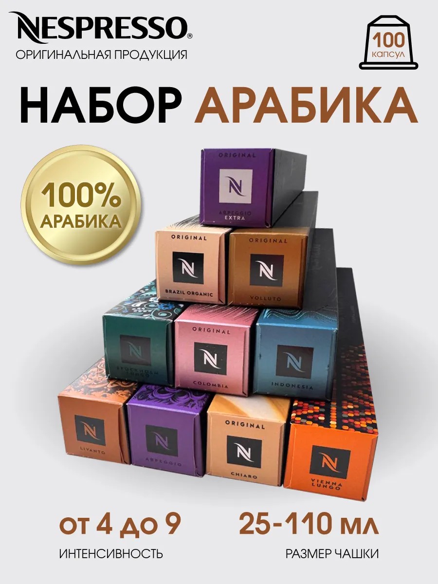 Набор капсул кофе Nespresso системы Original (10 блендов - 100 капсул кофе Арабика).