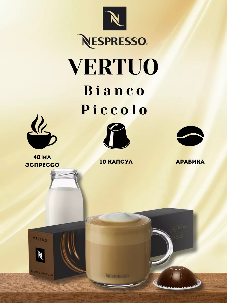 Кофе в капсулах Vertuo Bianco Piccolo - сладкий и гладкий, сливочная текстура, сладость, нотки карамели, ореха, бисквита.