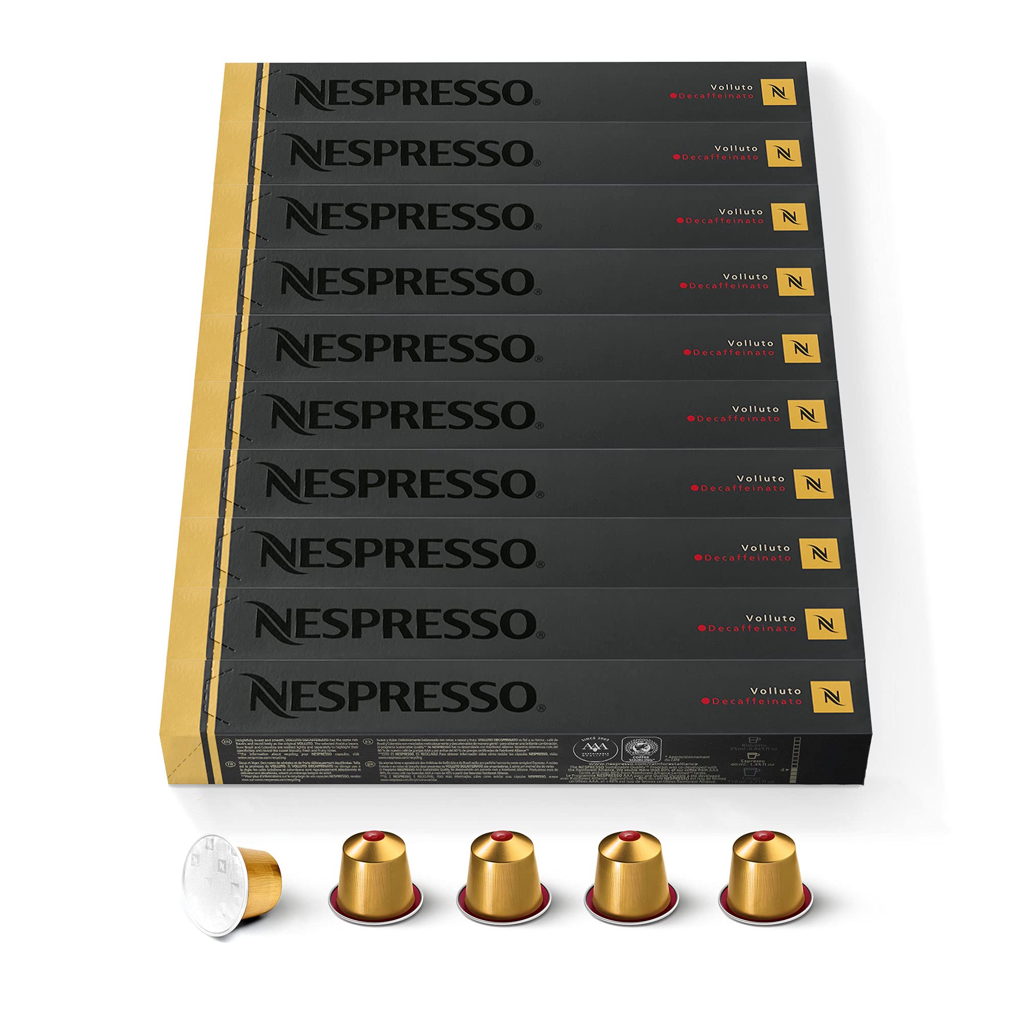 Nespresso Original – 100 Capsules de café décaféiné Volluto Decaffeinato – Intensité 4 – Pour Espresso – (10 étuis de 10)