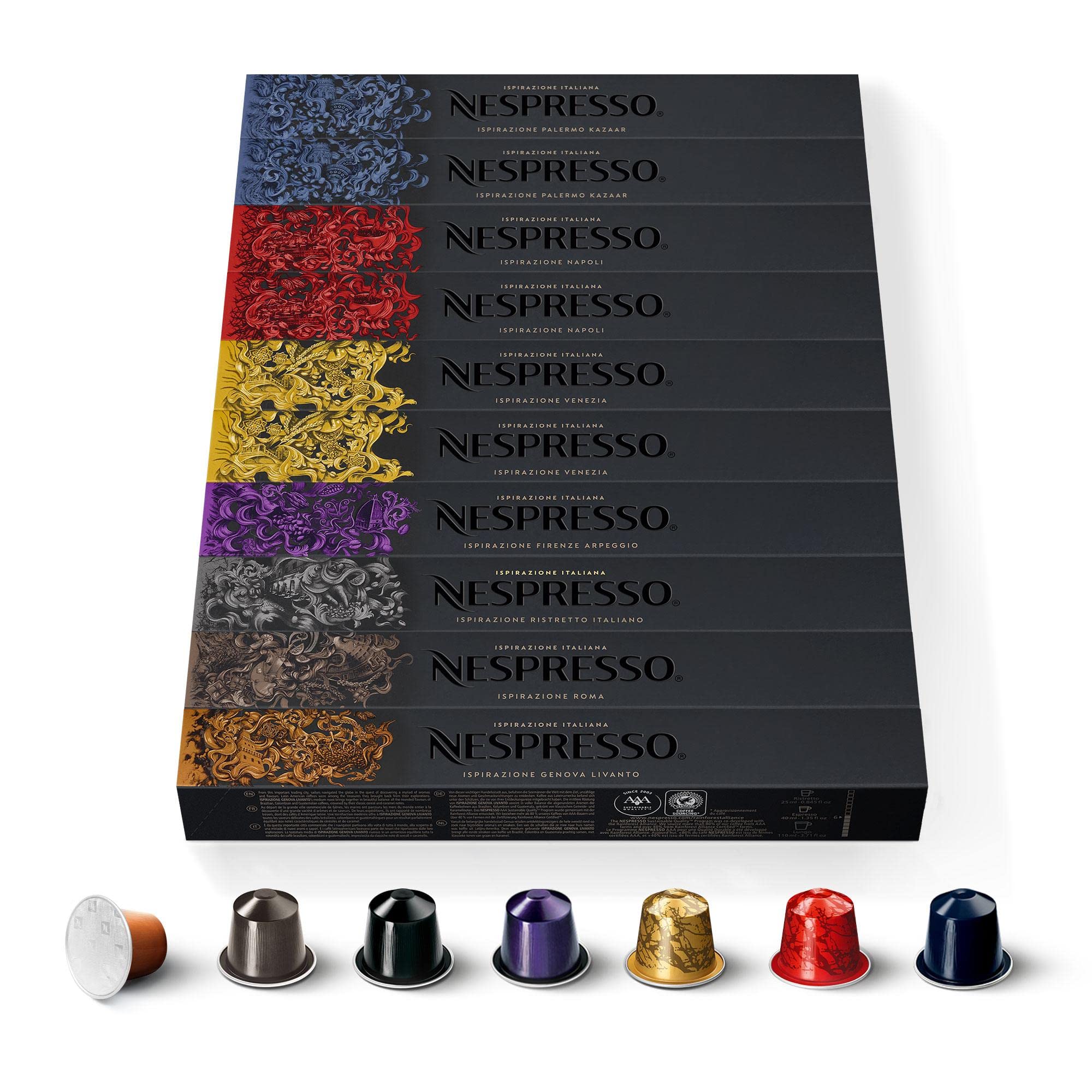 Discover the Ispirazione Italiana selection from Nespresso. Want to journey to the heart of intense Italian coffees? No need to go far! This assortment of 100 capsules contains a variety of coffees inspired by the distinct tastes and roasting expertise of regional Italian coffee and local life. It embodies each region's unique approach to coffee roasting. Includes: 20 Kazaar capsules, 10 Ristretto capsules, 10 Arpeggio capsules, 20 Napoli capsules, 20 Venezia capsules, 10 Roma capsules, and 10 Livanto capsules. Ingredients: Roasted and ground coffee for the Nespresso system, packaged in a protective atmosphere. INSTRUCTIONS FOR USE 1. Remove the coffee capsule from its packaging. 2. Open the lid of your Nespresso machine. 3. Place the coffee capsule in the capsule holder. 4. Close the lid of your Nespresso machine. 5. Choose your preferred cup strength and size. 6. Press the start button on your Nespresso machine.Nespresso Original - Bundle Inspiration Italienne 100 Capsules Café - 20x Kazaar, 20x Naples, Venise, Ristretto, Arpingo, Rome, Livanto Palerme Kazaar, Ristretto Italiano, Firenze Arpeggio, Napoli, Venezia, Roma, Genova Livanto 19.5 x 27.9 x 7.8 cmDESCRIPTION DU PRODUIT DESCRIPTION DU PRODUIT Découvrez la sélection Ispirazione Italiana de Nespresso. Vous voulez voyager au coeur des cafés intenses à l'italienne ? Pas besoin d'aller bien loin ! Cet assortiment de 100 capsules contient divers cafés inspirés par les goûts distincts et l'expertise de la torréfaction du café italien régional et de la vie locale. Il incarne l'approche unique de chaque région en matière de torréfaction du café. Inclus : 20 capsules Kazaar, 10 capsules Ristretto, 10 capsules Arpeggio, 20 capsules Napoli, 20 capsules Venezia, 10 capsules Roma et 10 capsules Livanto. Ingrédients : Café torréfié et moulu pour système Nespresso et conditionné sous atmosphère protectrice MODE D'EMPLOI 1. Retirez la capsule de café de son emballage. 2. Ouvrez le couvercle de votre machine Nespresso 3. Placez la capsule de café dans le porte-capsules. 4. Fermez le couvercle de votre machine Nespresso 5. Choisissez la force et la taille de votre tasse préférées. 6. Appuyez sur le bouton de démarrage de votre machine Nespresso