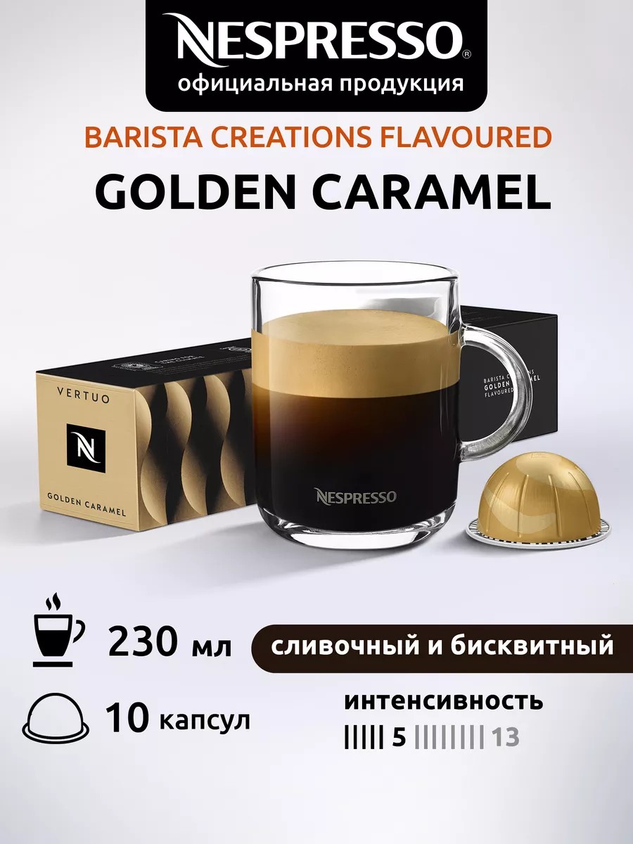 Капсульный кофе неспрессо вертуо со вкусом сливочной карамели это отличный способ побаловать себя и насладиться кофепитием в одиночку или с друзьями. В одной капсуле содержится богатый вкус арабики из Латинской Америки и Африки. Чтобы добавить кофе изысканных нот и особенное послевкусие, в капсулах GOLDEN CARAMEL смешали натуральную смесь жаренных зерен с восхитительным ароматом бисквита и карамели и получили чудесный напиток, который обязательно согреет и порадует вас в любое время дня, как на работе, так и дома. Просто используйте капсулу в кофемашине Vertuo, регулируя объем воды и молока парой нажатий и чудесный кофе готов!