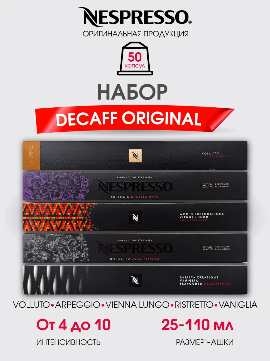 Набор капсул кофе Nespresso Decaffeinato Original (5 блендов - 50 капсул без кофеина).