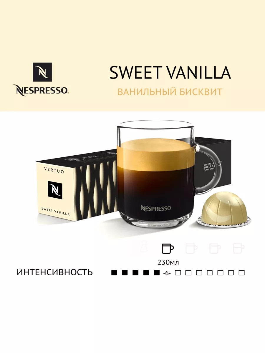 BARISTA CREATIONS Sweet Vanilla: насыщенный и бархатистый аромат ванили в этом мягком бленде из зёрен латиноамериканской и африканской Арабики придаёт кофе шелковистую нежную и обволакивающую текстуру. Словно нежное ванильное пирожное. BARISTA CREATIONS Sweet Vanilla — это сладкое удовольствие с классической нотой ванили в сочетании с тонкими оттенками миндаля и печенья, которое удивит Вас своей нежной и бархатистой текстурой. Капсулы для кофемашины Nespresso (Vertuo) от компании Nestle. Конусообразная капсула из алюминия, внутри покрыта пищевой защитной плёнкой, чтобы защитить кофе от взаимодействия с металлом. Данная технология позволяет сохранять аромат свежемолотого кофе больше года, что недоступно бумажным или вакуумным упаковкам. Великолепное сочетание простоты приготовления и яркого, насыщенного вкуса завоевало сердца любителей кофе во всем мире. Кофе-капсулы оригинальные набор подходят только для кофемашин кофеварок системы Vertuo