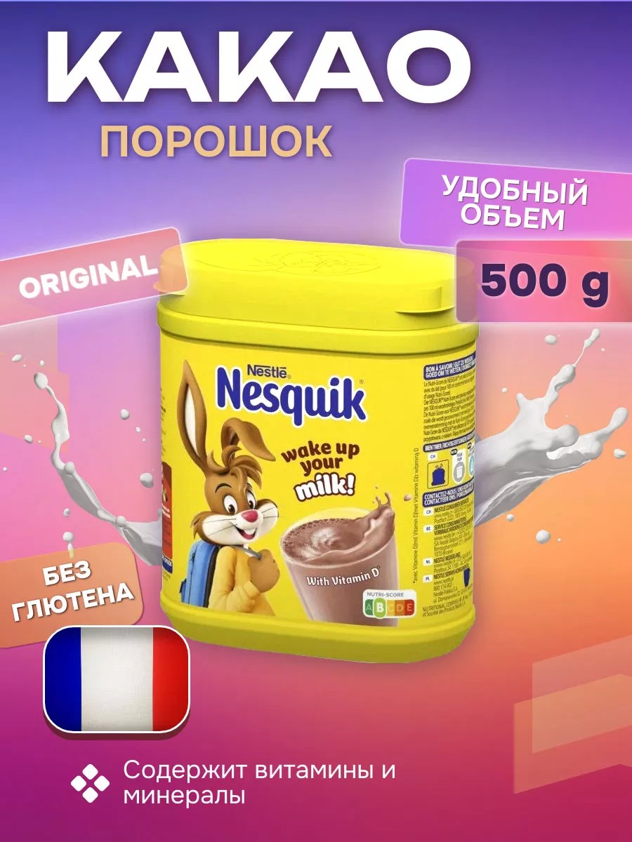 Какао - напиток быстрорастворимый Nesquik от Nestle, 500 г. Производитель Франция. Быстрорастворимый напиток какао Несквик производится знаменитым брендом Нестле более 70 лет и знаком большинству жителей нашей планеты. Как бы не видоизменялись упаковка и мультяшный герой кролик Квики на протяжении этих лет, основной состав продукта оставался практически неизменным. 18 процентов от общего веса составляет какао-порошок, остальное – вспомогательные вещества, улучшающие вкус, и витаминизированные добавки. Подходит для вегетарианцев.