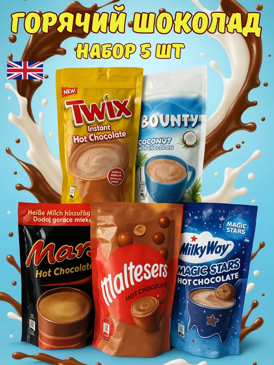набор сладостей из горячего шоколада Bounty Twix MilkyWay Mars Maltesers. Набор горячего шоколада Баунти Марс, Твикс, Мальтезерс, Милки Вей со вкусами по одноименных шоколадных батончиков и конфет. Пять пакетов с разными вкусами чудесного горячего шоколада, каждый весом по 140 грамм.