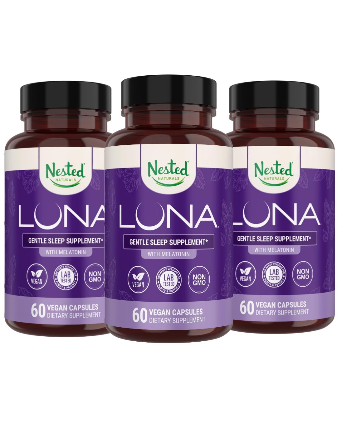 Nested Naturals Luna Herbal Sleep Supplement with Melatonin Valerian Root Chamomile | 180 Vegan Capsules (3-Pack) - 60 Capsules Per Bottle
