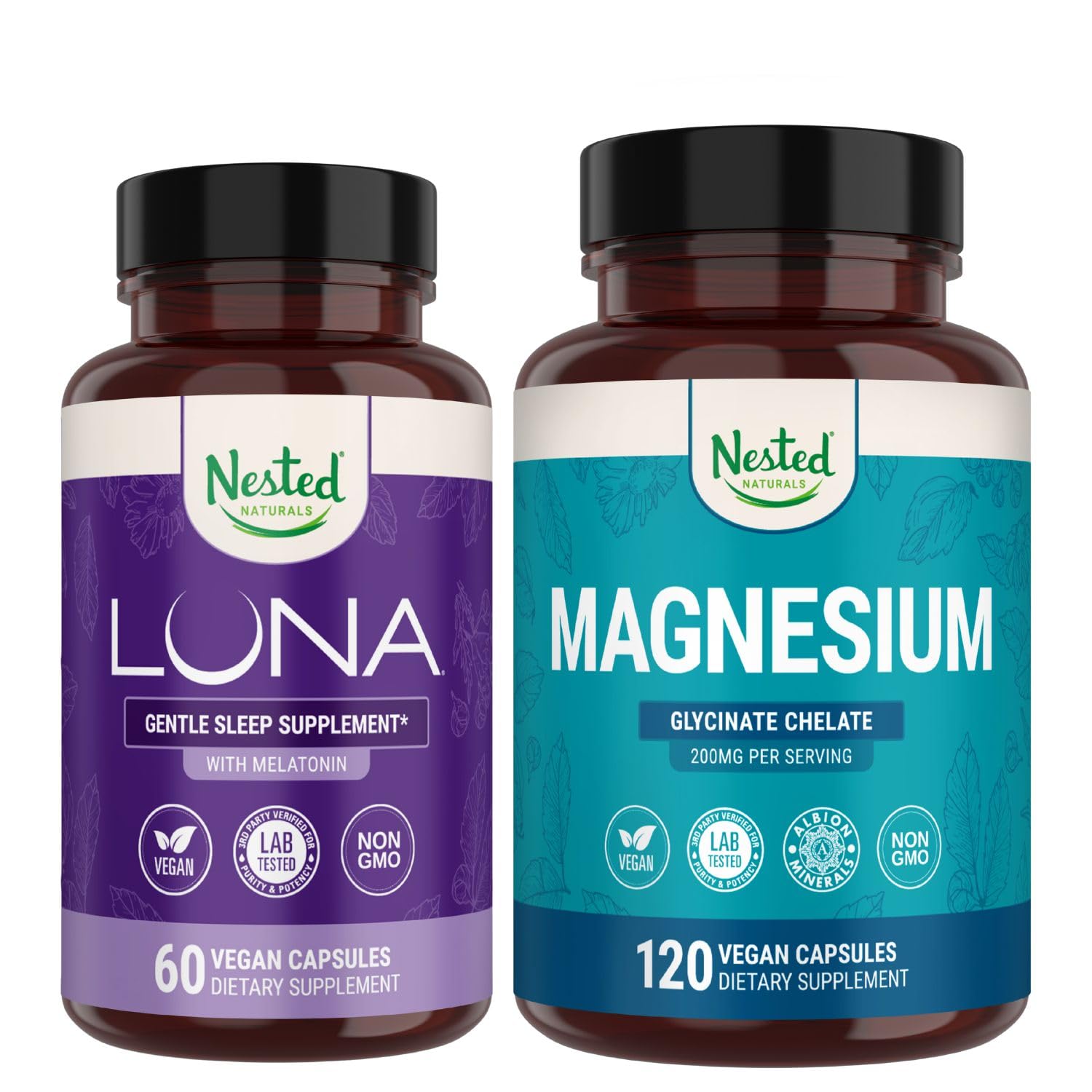Nested Naturals Luna Sleep Aid & Magnesium Glycinate Chelate for Sleep Relaxation & Recovery (180 Capsules)