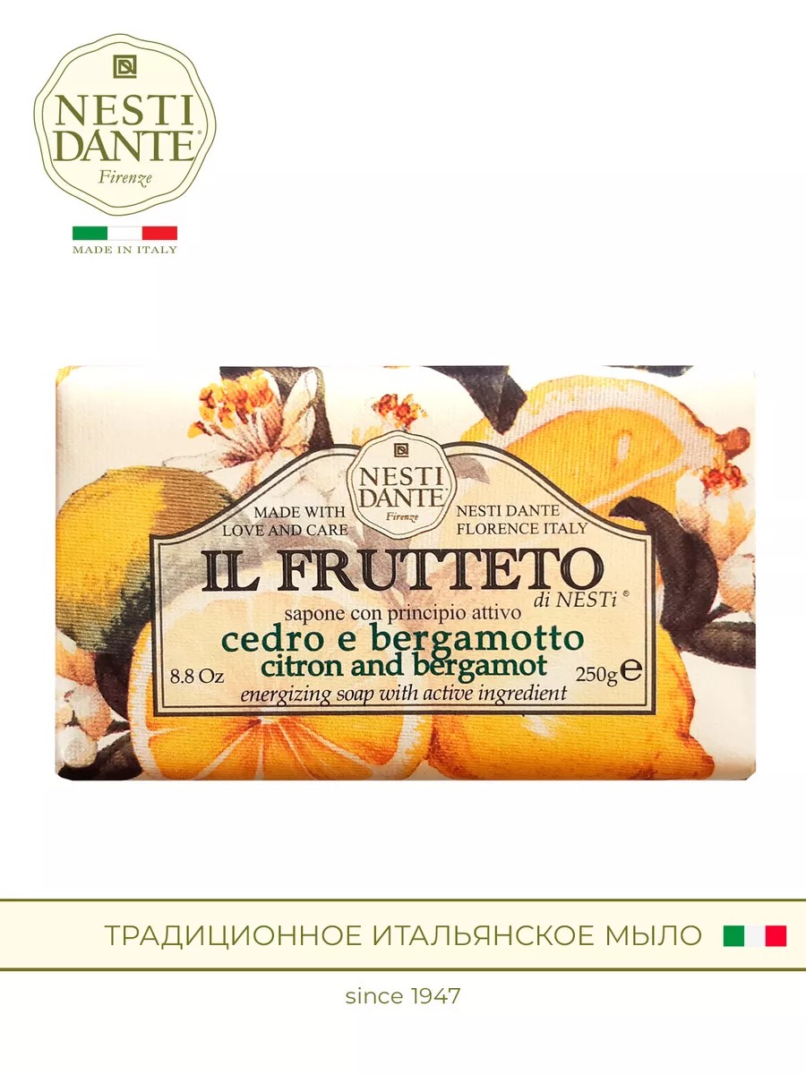 Nesti Dante - экологически чистое мыло, обогащенное растительными экстрактами и маслами. Производится во Флоренции с 1947 года по старинной котловой технологии варки мыла. Не содержит вредных поверхностно-активных веществ, сульфатов, парабенов, синтетических масел и искусственных красителей. Без аллергенов и ингредиентов животного происхождения. Мыло не размокает и быстро восстанавливается после длительного контакта с водой.Кулинарные традиции Тосканы, и Флоренции в частности, несколько отличаются от кухни остальной Италии. Но что остается неизменным так это большое разнообразие фруктов на десерт. Линия мыла Il Frutteto (Фруктовое) - настоящая фруктовая корзина с итальянским темпераментом!Citron and Bergamot (Лимон и бергамот) обладает легким цитрусовым ароматом. Экстракт лимона (citrus limon flofer/ leaf/ stem extract) в составе обладает регенерирующим и тонизирующим свойствами.Каждый кусочек мыла с любовью и заботой для вашей кожи.Вы можете приобретать мыло Nesti Dante не только в подарок - день рождения, новый год, рождество, день всех влюбленных, 14 февраля, 8 марта, 23 февраля – но и без повода, просто чтобы подарить приятные эмоции себе или близким.Сделано в Италии. Мыло Nesti Dante можно найти по запросу: мыло туалетное твердое, мыло косметическое, мыло подарочное, мыло на 2023 год, итальянское мыло, красота для женщин, красота из италии.