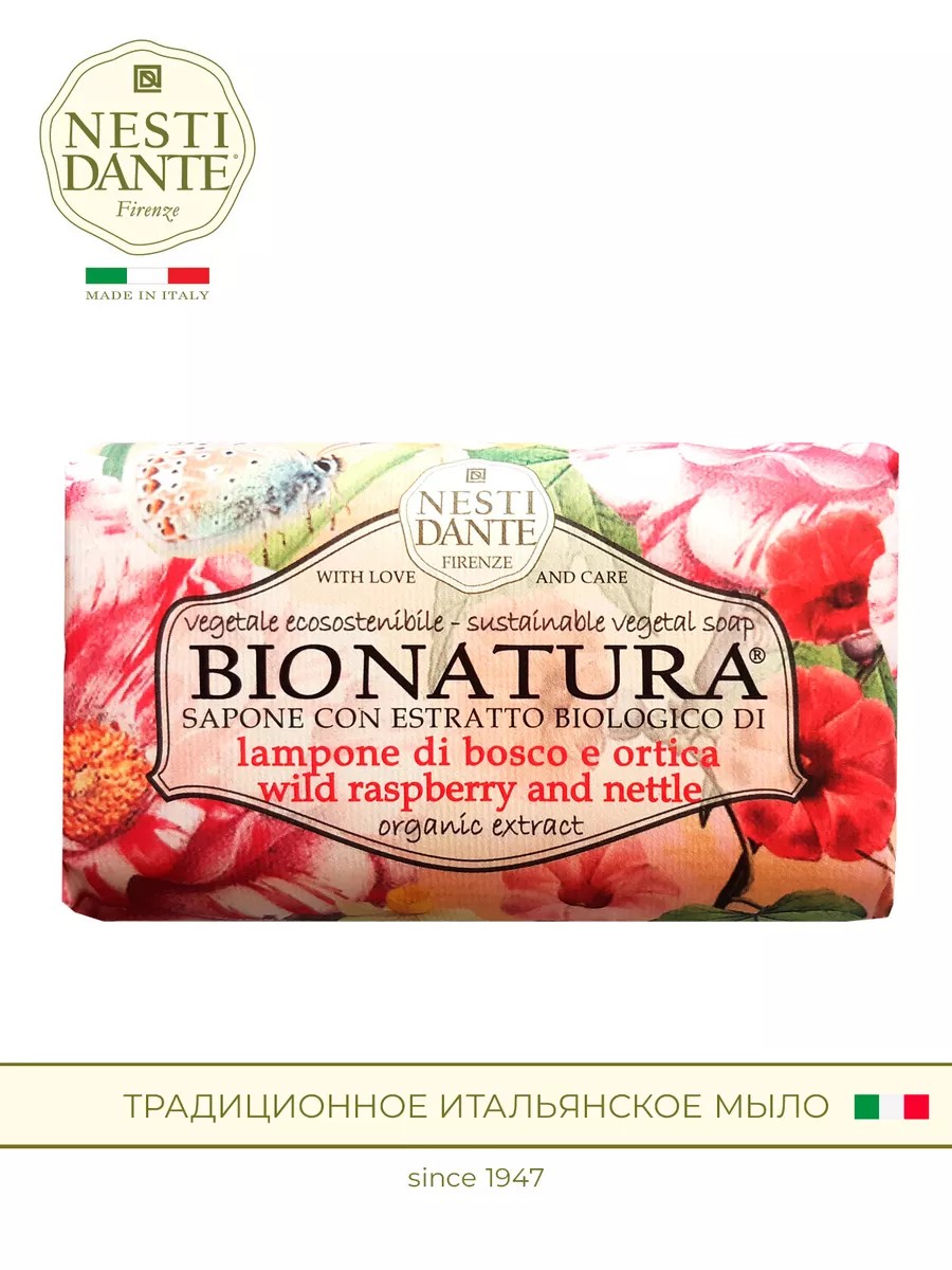 Nesti Dante экологически чистое мыло, обогащенное растительными экстрактами и маслами. Производится во Флоренции с 1947 года по старинной котловой технологии варки мыла. Не содержит вредных поверхностно-активных веществ, сульфатов, парабенов, синтетических масел и искусственных красителей. Без аллергенов и ингредиентов животного происхождения. Кусок мыла не размокает и быстро восстанавливается после длительного контакта с водой. Коллекция органического мыла Bio Natura (Био Натура) обогащена натуральными экстрактами. Для производства этих растительных ингредиентов Nesti Dante использует сырье, поставляемое со специальных плантаций из экологически чистых регионов. Wild Raspberry & Nettle (Малина и крапива) имеет душистый ягодно-зеленый аромат. Экстракт малины увлажняет, питает, тонизирует. Экстракт крапивы источник, богатый витаминами A и E, является мощным антиоксидантом. Содержит ценные минеральные вещества, которые питают и защищают кожу.