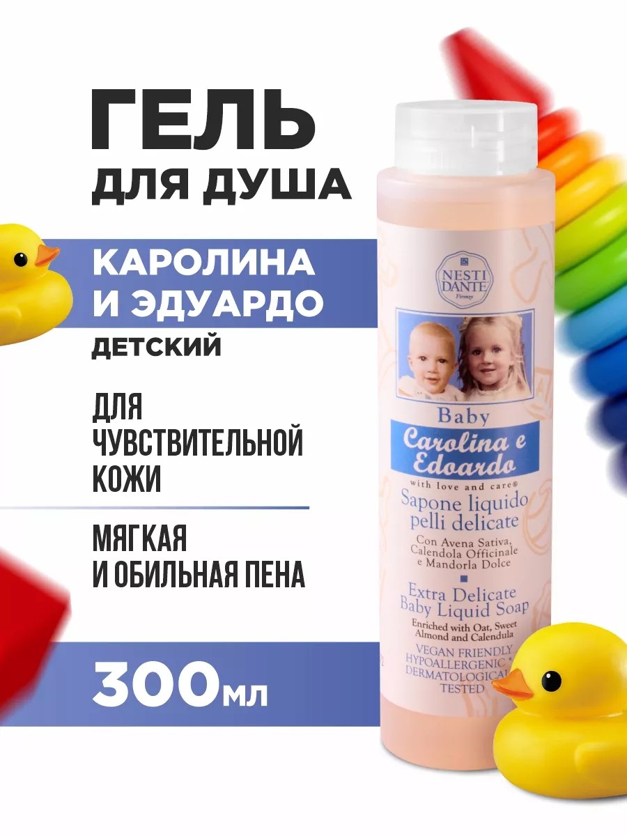 Гель для душа детский Каролина и Эдуардо 300мл. Детская кожа требует особого ухода и постоянного внимания. Поэтому в Nesti Dante разработали специальную щадящую формулу, чтобы помочь малышам наслаждаться их первыми контактами с водой. Подходит для детей и взрослых с чувствительной кожей. Протеины миндаля (sweet almond protein) эффективно увлажняют и питают кожу, оказывают регенерирующее действие. Экстракт овса (avena sativa oat kernel extract) - мощный антиоксидант, эффективно питает и увлажняет. Календула (calendula officinalis flower extract) - увлажняет, смягчает, успокаивает. Гель для душа Baby Carolina e Edoardo имеет нейтральный аромат чистоты. Жидкое мыло и гели Nesti Dante производится исключительно из растительных масел и содержит 100% оливковое масло. Содержащееся в продуктах оливковое масло известно как "эликсир молодости" благодаря высокой концентрацией витамина Е, который помогает бороться с образованием свободных радикалов, повинных в старении кожи. Гель для душа детский для девочек и для мальчиков. Способ применения: использовать для ежедневной гигиены тела. Не рекомендуется для ухода за волосами. Избегать попадания в глаза, в случае попадания - промыть холодной водой. Подходит для всех типов кожи, включая чувствительную.