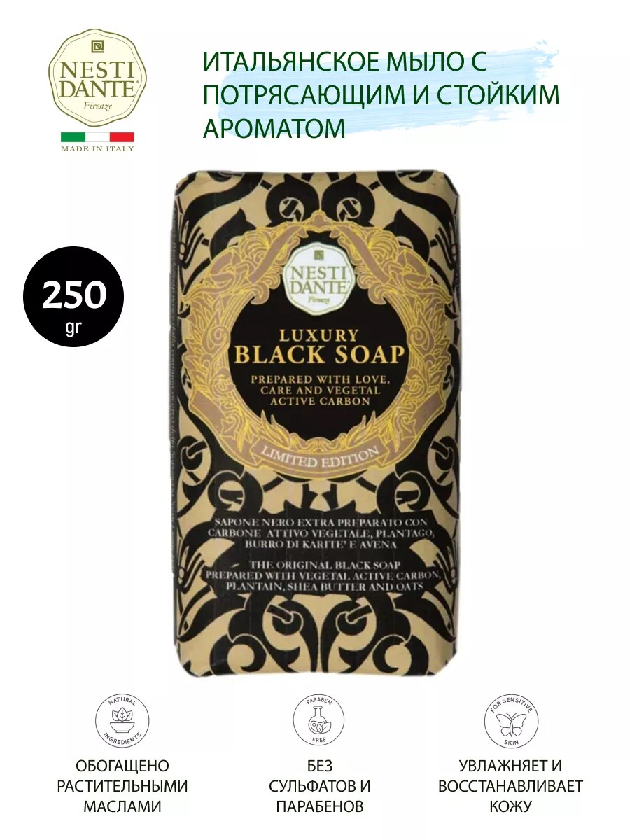 Выбирая Nesti Dante ANNIVERSARY Роскошное чёрное / Luxury black soap 250 гр, вы получаете качественный продукт, который обеспечит вашей коже необходимый уход и заботу.