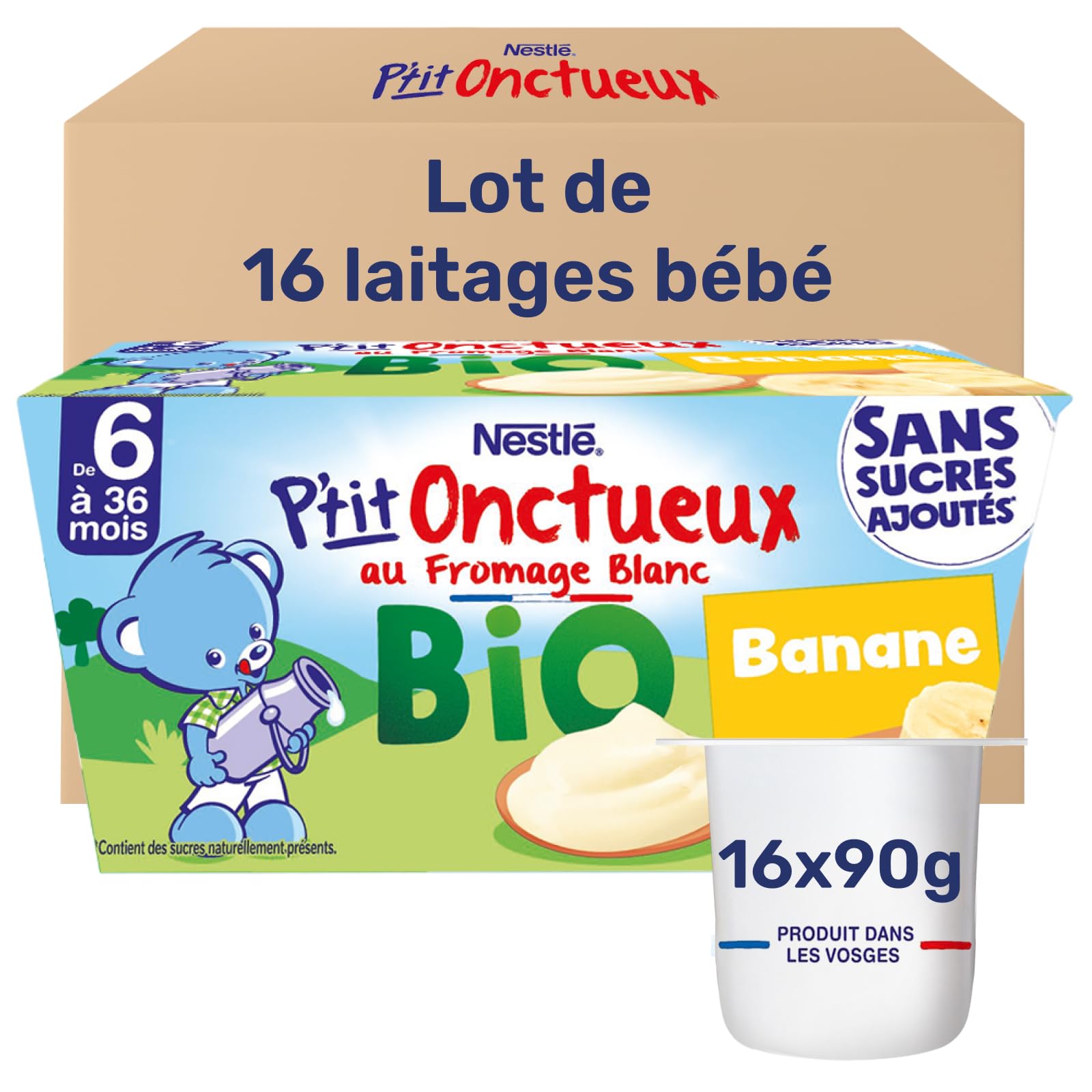 : NESTLE P'TIT ONCTUEUX ORGANIC with Banana Fromage Blanc, the dairy product that's good for you, with a smooth texture specially designed for babies , with no added sugars . Fruits selected according to strict specifications . Produced in Arches in the Vosges region with French milk. Convenient, it can be taken anywhere thanks to our specific manufacturing process which allows it to be stored without refrigeration. Baby food is subject to very strict regulations, particularly regarding pesticides. Therefore, we carefully select the fruits we use. In accordance with baby food regulations. Contains naturally occurring sugars. Ingredients: Fermented MILK 32 (whole MILK, lactic ferments), water, banana puree 19 , fromage blanc made with pasteurized skimmed MILK 17 , corn starch, CREAM, skimmed MILK powder, concentrated lemon juice, thickeners (locust bean gum, pectin), antioxidant (ascorbic acid). Ingredients from organic farming. Safety Warning: store at room temperature (5-25 C). Disclaimer: Photograph is not contractual. The information above is provided for informational purposes only. It is not necessarily exhaustive and cannot replace the information on the product packaging, which is the only authoritative source and to which you should refer, particularly in case of food intolerance. See more