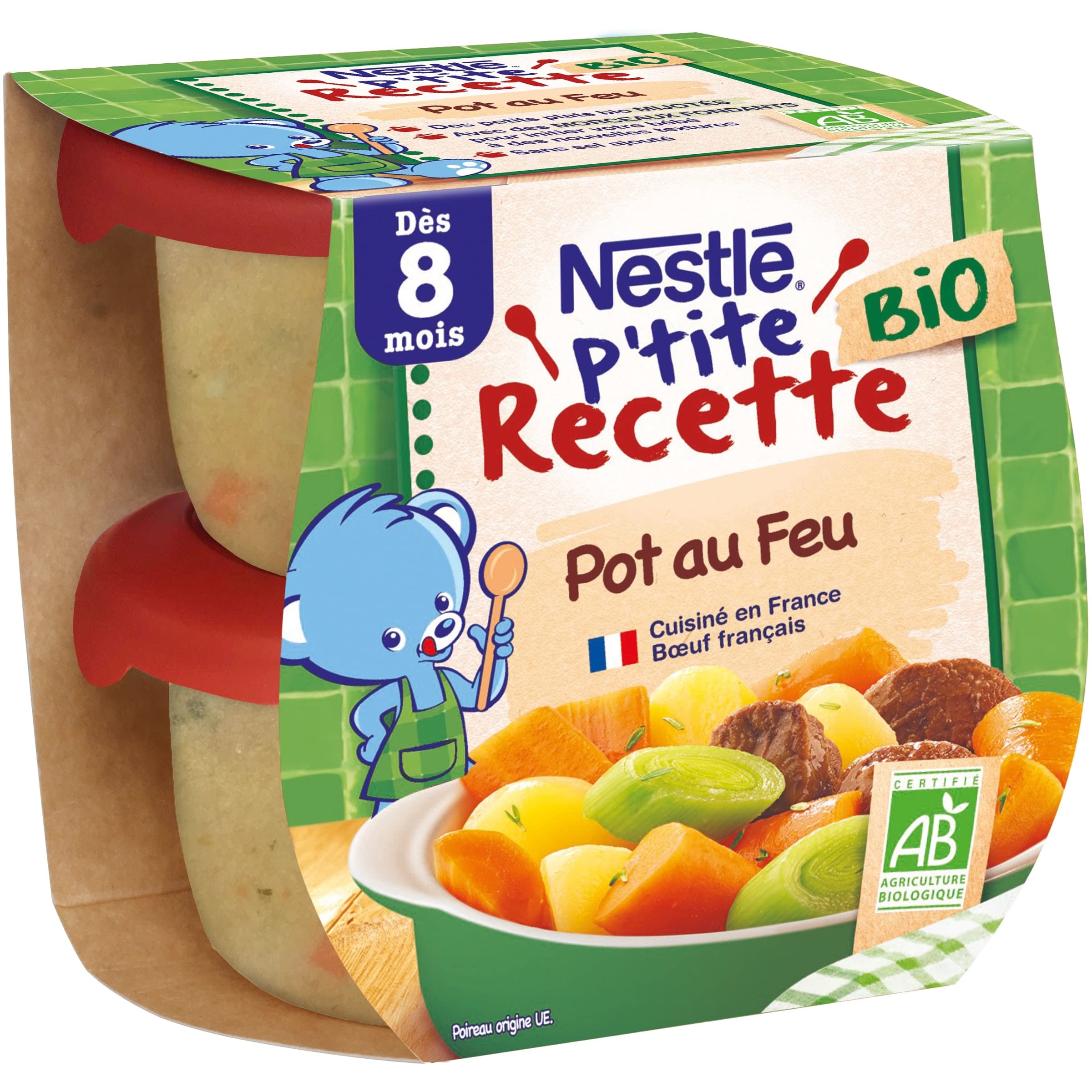 : Discover our NESTLÉ P'tite Recette BIO organic baby food, Pot au Feu: a classic French dish from Lorraine, adapted for babies from 8 months with soft pieces to introduce them to new textures. Made with ingredients from organic farming, contributing to respect for the environment and biodiversity . Slow-cooked vegetables and beef, flavored with thyme, to awaken your baby to new tastes. A recipe prepared in France with French beef. Let's all participate in the ecological transition: we've removed the lids from our jars to reduce plastic by 40 per jar ! Leeks of EU origin. Ingredients: Cooking water, carrots 29 , potatoes 13 , beef (origin: France) 8 , onions , leeks 6 , starch, rapeseed oil , thyme , garlic . Ingredients from organic farming Instructions for use: Before opening, store at room temperature. Once opened, a covered jar can be kept in the refrigerator for 48 hours, unless your baby has eaten directly from the jar. In that case, discard any unfinished food. See more