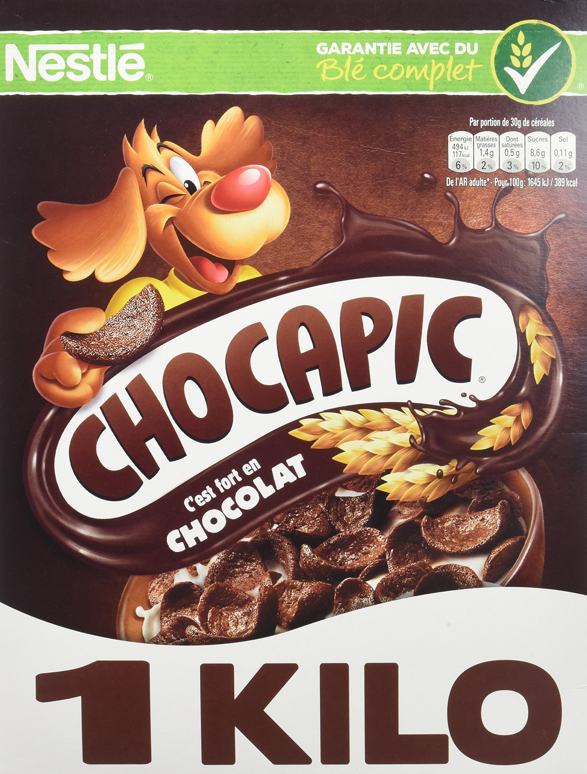 CHOCAPIC delicious cereal flakes with a hint of chocolate. INGREDIENTS Cereals 61.9 (whole wheat 31.8 , wheat flour, corn semolina), chocolate powder 22.2 (sugar, cocoa powder), sugar, glucose syrup, BARLEY malt extract, palm oil, emulsifier: sunflower lecithin, salt, flavorings, vitamins (niacin (PP), pantothenic acid (B5), riboflavin (B2), vitamin B6, thiamine (B1), folic acid (B9), vitamin D) and minerals (calcium carbonate, iron). May contain milk, peanuts and tree nuts.CHOCAPIC is packed with chocolate. Also available in bar form. And always with whole wheat (31.8 ), vitamins, iron, and calcium. CHOCAPIC is a delicious cereal flake packed with chocolate. CHOCAPIC de délicieux pétales de céréales forts en chocolat. INGRÉDIENTS Céréales 61,9 (BLE complet 31,8 , farine de BLE, semoule de maïs), chocolat en poudre 22,2 (sucre, cacao en poudre), sucre, sirop de glucose, extrait de malt d'ORGE, huile de palme, émulsifiant : lécithine de tournesol, sel, arômes, vitamines (niacine (PP), acide pantothénique (B5), riboflavine (B2), vitamine B6, thiamine (B1), acide folique (B9), vitamine D) et minéraux (carbonate de calcium, fer). Peut contenir du lait, des arachides et fruits à coque.CHOCAPIC, c'est fort en chocolat. Existe aussi sous forme de barres. Et toujours, du blé complet (31,8 ), des vitamines, du fer et du calcium. CHOCAPIC de délicieux pétales de céréales forts en chocolat.