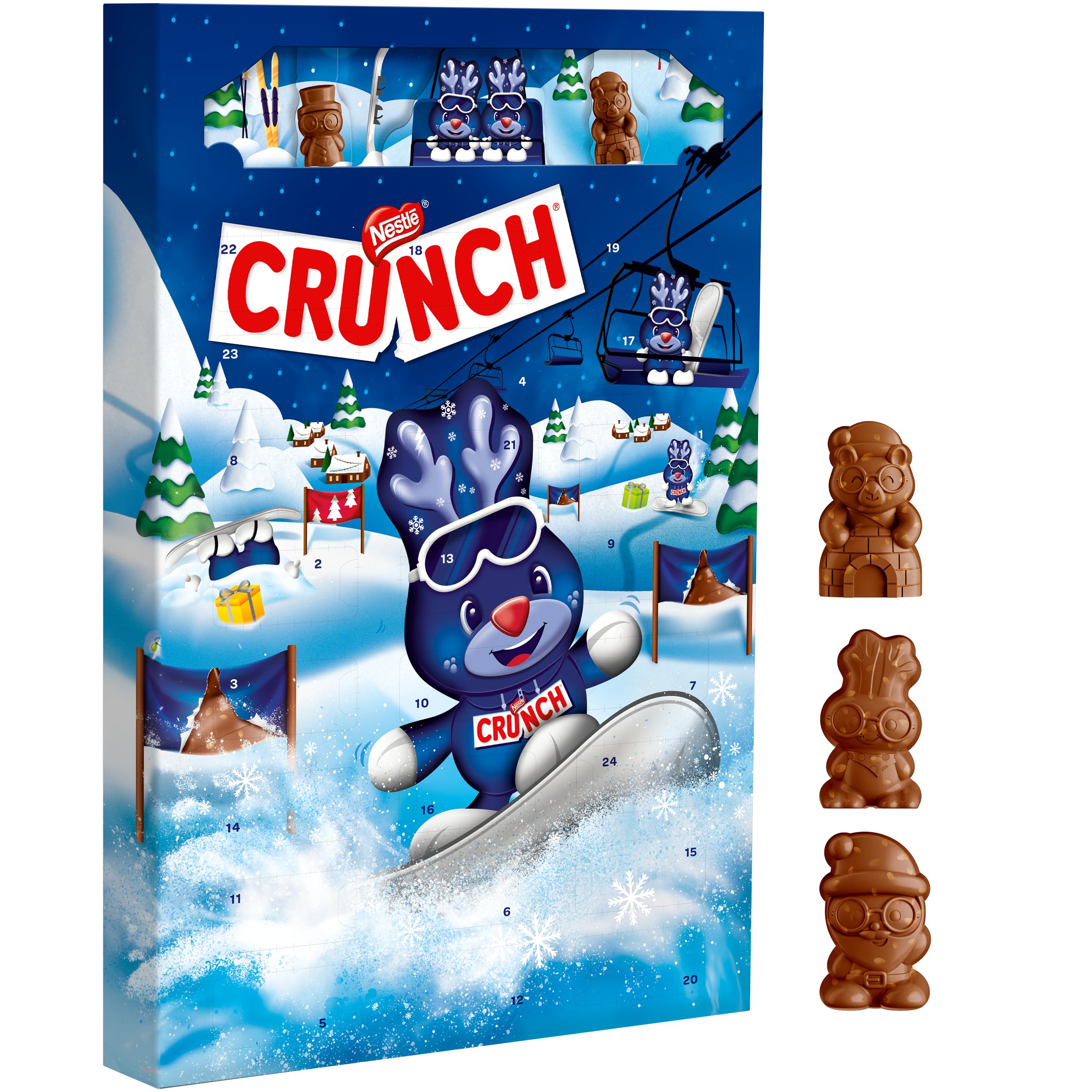 Wait until Christmas with the CRUNCH advent calendar. Fill up on sensations with CRUNCH Milk: a delicious combination of pure cocoa butter milk chocolate and extra crunchy cereals. INGREDIENTS Ingredients: sugar, cocoa butter , cocoa mass , MILK powder, skimmed MILK powder, crispy cereals (4.8 ) (rice flour, sugar, fat-reduced cocoa1, salt), WHEY powder, anhydrous MILK fat, emulsifier (lecithins), natural vanilla flavoring. Cocoa solids 29 minimum in milk chocolate. Rainforest Alliance certified mass balance www.ra.org fr May contain: NUTS. DIRECTIONS FOR USE Refer to the instructions on the packaging SAFETY WARNING Important: Young children (under 4 years) have limited chewing abilities and can choke on small confectionery. (under 4 years) Crunch is crunchy for the planet: Nestlé is partnering with the Rainforest Alliance to support more sustainable cocoa production. The perfect surprise to delight during the holiday season celebrate Christmas with Crunch. This advent calendar contains 24 milk chocolate figurines with crispy puffed rice. Wait until Christmas with the new Crunch Advent Calendar. Patientez jusqu'à Noël avec le calendrier de l'avent CRUNCH . Faites le plein de sensations avec CRUNCH Lait : une savoureuse alliance de chocolat au lait pur beurre de cacao et de céréales extra croustillantes. INGRÉDIENTS Ingrédients : sucre, beurre de cacao , pâte de cacao , LAIT en poudre, LAIT écrémé en poudre, céréales croustillantes (4,8 ) (farine de riz, sucre, cacao maigre1, sel), PETIT-LAIT en poudre, matière grasse de LAIT anhydre, émulsifiant (lécithines), arôme naturel de vanille. Cacao 29 minimum dans le chocolat au lait . Bilan massique certifié Rainforest Alliance www.ra.org fr Peut contenir: FRUITS A COQUE. MODE D'EMPLOI Se référer aux instructions indiquées sur l'emballage AVERTISSEMENT DE SÛRETÉ Important : Les jeunes enfants (moins de 4 ans) ont des capacités de mastication limitées et peuvent s'étouffer avec des confiseries de petite taille. (moins de 4 ans) Crunch croustille pour la planète : Nestlé s'engage avec Rainforest Alliance pour soutenir une production plus durable de cacao. La surprise idéale pour faire plaisir lors des fêtes de fin d'année fêtez Noël avec Crunch. Ce calendrier de l'avent contient 24 figurines au chocolat au lait au riz soufflé croustillant. Patientez jusqu'à Noël avec le nouveau Calendrier de l'Avent Crunch.