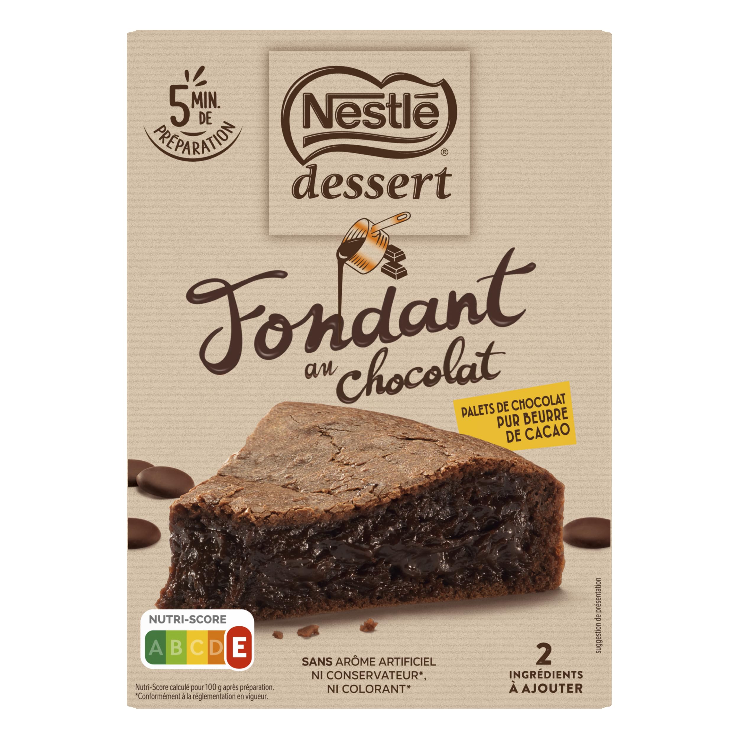 : NESTLE DESSERT cake mixes combine real NESTLE DESSERT chocolate discs to melt with a sachet of pre-measured ingredients for delicious, quick, and easy-to-make cakes. NESTLE DESSERT, a 100 pure cocoa butter chocolate with a unique melting texture, is carefully prepared from selected cocoa beans. Ingredients: Sachet of dark chocolate (175g, 53 cocoa): sugar, cocoa mass¹, cocoa butter¹, emulsifier (lecithins), natural Madagascar vanilla flavoring. Sachet of cake mix (142g): sugar, WHEAT flour, raising agents (sodium carbonates, citric acid). May contain: MILK. ¹Rainforest Alliance Certified mass balance. www.ra.org fr. To support more sustainable cocoa production, Nestlé purchases an equivalent amount of Rainforest Alliance certified cocoa to that required for this product. Instructions: 1. Preheat your oven for 15 minutes at 180 C (350 F) using conventional heat or 160 C (325 F) using fan-assisted heat. 2. In a bowl, melt the chocolate chips and 90g of butter in the microwave at 500W for 2 minutes. Mix well. 3. Add 4 eggs and the contents of the sachet, and mix well. Pour into a greased 24cm (9.5-inch) non-stick cake tin. 4. Bake one at a time on a rack in the middle of the oven for 14-15 minutes. The surface of the fondant should be firm. Extend the baking time if necessary. For easy unmolding, let cool for 30 minutes. Safety Warning: Do not expose to sunlight. See moreNo preservatives. No artificial flavors or colors. Ready in 5 minutes. One melt. Pure cocoa butter.Description du produit Les préparations pour gâteaux NESTLE DESSERT c'est l'alliance de vrais palets de chocolat NESTLE DESSERT à faire fondre et d'un sachet de préparation aux ingrédients pré-dosés pour des gâteaux gourmands, rapides et faciles à réaliser. NESTLE DESSERT, un chocolat 100 Pur beurre de cacao, à la fonte unique, préparé avec soin à partir de fèves sélectionnées. Ingrédients Ingrédients : Sachet de chocolat noir supérieur à 53 de cacao (175 g) : sucre, pâte de cacao¹, beurre de cacao¹, émulsifiant (lécithines), arôme naturel de vanille de Madagascar. Sachet de préparation pour fondant (142 g) : sucre, farine de BLÉ, poudres à lever (carbonates de sodium, acide citrique). Peut contenir : LAIT. ¹Bilan massique certifié Rainforest Alliance. www.ra.org fr. Pour soutenir une production plus durable du cacao, Nestlé achète une quantité de cacao certifiée Rainforest Alliance équivalente à celle nécessaire pour ce produit. P.when('A').execute(function(A) { A.on('a:expander:toggle_description:toggle:collapse', function(data) { window.scroll(0, data.expander. expander[0].offsetTop-100) }) }) Mode d'emploi 1 . Préchauffez votre four 15 minutes à 180 C en chaleur traditionnelle ou à 160 C en chaleur tournante. 2 . Dans un saladier faites fondre les palets de chocolat et 90 g de beurre au four à micro-ondes à 500W pendant 2 minutes. Mélangez. 3 . Ajoutez 4 œufs et le contenu du sachet, mélangez. Versez dans un moule à manqué en téflon de 24 cm beurré. 4 . Faites cuire une seule préparation à la fois, sur une grille en milieu de four, 14-15 minutes. La surface du fondant doit présenter une texture ferme. Prolongez la cuisson si nécessaire. Pour un démoulage réussi laissez refroidir 30 minutes. Avertissement De Sûreté Ne pas exposer au soleil. Voir plusSans conservateur. Sans arôme artificiel et sans colorant. Prêt en 5 minutes. Une fonte unique. Pur beurre de cacao.Nestlé Dessert - Préparation pour Gâteau - Fondant au Chocolat - 317g Fondant Chocolat 317 g (Lot de 1)