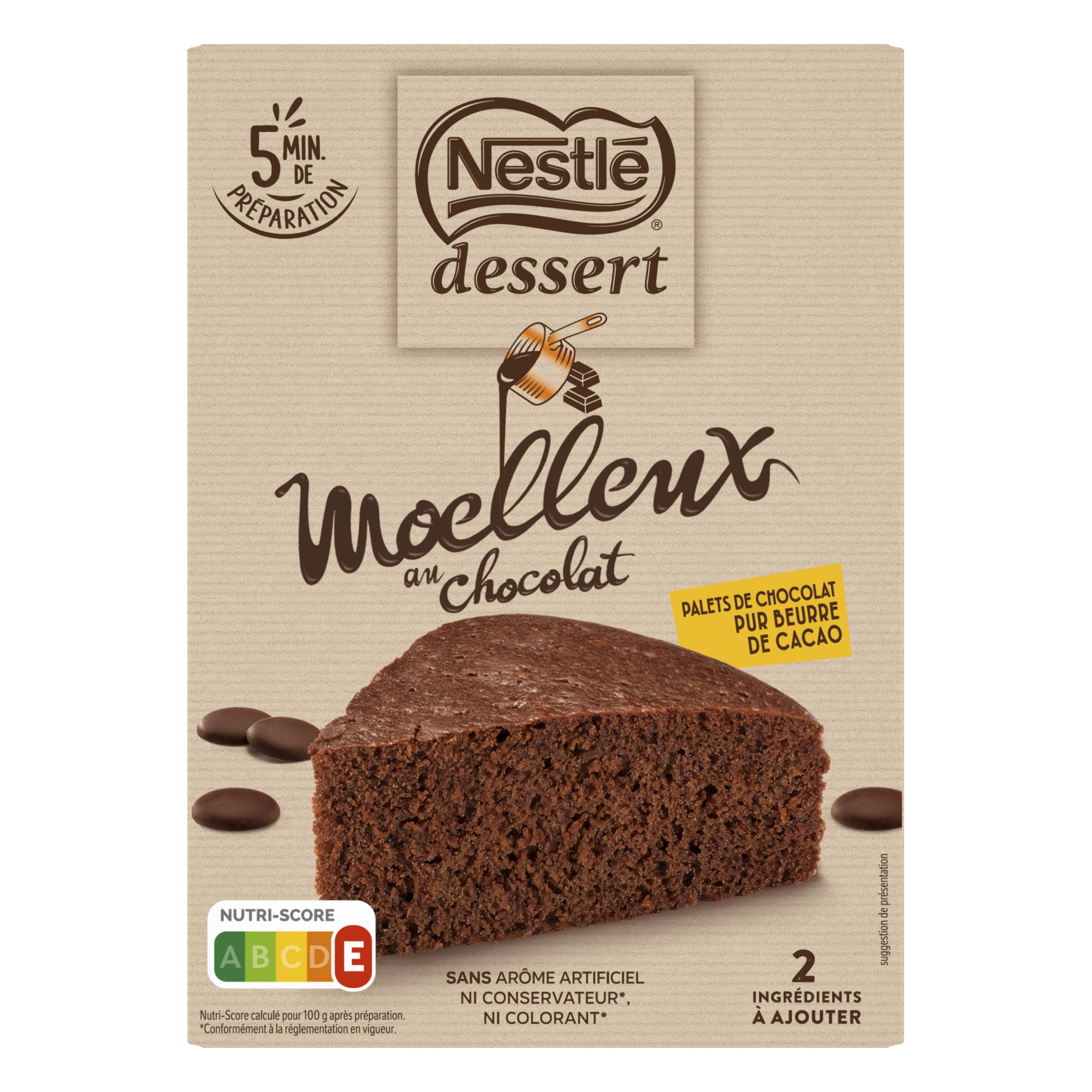 : NESTLE DESSERT cake mixes combine real NESTLE DESSERT chocolate discs to melt with a sachet of pre-measured ingredients for delicious, quick, and easy-to-make cakes. NESTLE DESSERT, a 100 pure cocoa butter chocolate with a unique melting texture, is carefully prepared from selected cocoa beans. Ingredients: Sachet of dark chocolate (175g, 53 cocoa): sugar, cocoa mass¹, cocoa butter¹, emulsifier (lecithins), natural Madagascar vanilla flavoring. Sachet of cake mix (169g): sugar, WHEAT flour, raising agents (sodium carbonates, citric acid). May contain: MILK. ¹Rainforest Alliance certified mass balance. www.ra.org fr. To support more sustainable cocoa production, Nestlé purchases an equivalent amount of Rainforest Alliance certified cocoa to that required for this product. P.when('A').execute(function(A) { A.on('a:expander:toggle_description:toggle:collapse', function(data) { window.scroll(0, data.expander. expander[0].offsetTop-100) }) }) Instructions: 1. Preheat your oven to 160 C (325 F) for 15 minutes. 2. In a bowl, melt the chocolate chips and 90g of butter in the microwave at 500W for 2 minutes. Mix. 3. Add 4 eggs and the contents of the sachet. Mix. Pour into a greased 24cm (9.5-inch) non-stick cake tin. 4. Bake one at a time on a rack in the middle of the oven. Bake for 27 minutes in a conventional oven or 25 minutes in a fan oven. Check the cake is cooked by inserting a knife. It should come out clean. Safety Warning: Do not expose to sunlight. See moreNo preservatives. No artificial flavors or colors. Ready in 5 minutes. One melt. Pure cocoa butter.Description du produit Les préparations pour gâteaux NESTLE DESSERT c'est l'alliance de vrais palets de chocolat NESTLE DESSERT à faire fondre et d'un sachet de préparation aux ingrédients pré-dosés pour des gâteaux gourmands, rapides et faciles à réaliser. NESTLE DESSERT, un chocolat 100 Pur beurre de cacao, à la fonte unique, préparé avec soin à partir de fèves sélectionnées. Ingrédients Ingrédients : Sachet de chocolat noir supérieur à 53 de cacao (175 g) : sucre, pâte de cacao¹, beurre de cacao¹, émulsifiant (lécithines), arôme naturel de vanille de Madagascar. Sachet de préparation pour moelleux (169 g) : sucre, farine de BLÉ, poudres à lever (carbonates de sodium, acide citrique). Peut contenir : LAIT. ¹Bilan massique certifié Rainforest Alliance. www.ra.org fr. Pour soutenir une production plus durable du cacao, Nestlé achète une quantité de cacao certifiée Rainforest Alliance équivalente à celle nécessaire pour ce produit. P.when('A').execute(function(A) { A.on('a:expander:toggle_description:toggle:collapse', function(data) { window.scroll(0, data.expander. expander[0].offsetTop-100) }) }) Mode d'emploi 1 . Préchauffez votre four 15 minutes à 160 C. 2 . Dans un saladier faites fondre les palets de chocolat et 90 g de beurre au four à micro-ondes à 500W pendant 2 minutes. Mélangez. 3 . Ajoutez 4 œufs et le contenu du sachet. Mélangez. Versez dans un moule à manqué en téflon de 24 cm beurré. 4 . Faites cuire une seule préparation à la fois. Sur une grille en milieu de four. 27 minutes en chaleur traditionnelle ou 25 minutes en chaleur tournante. Vérifiez la cuisson du gâteau en piquant avec la pointe d'un couteau. Celle-ci doit ressortir sèche. Avertissement De Sûreté Ne pas exposer au soleil. Voir plusSans conservateur. Sans arôme artificiel et sans colorant. Prêt en 5 minutes. Une fonte unique. Pur beurre de cacao.Nestlé Dessert - Préparation pour Gâteau - Moelleux au Chocolat - 344g Moelleux Chocolat
